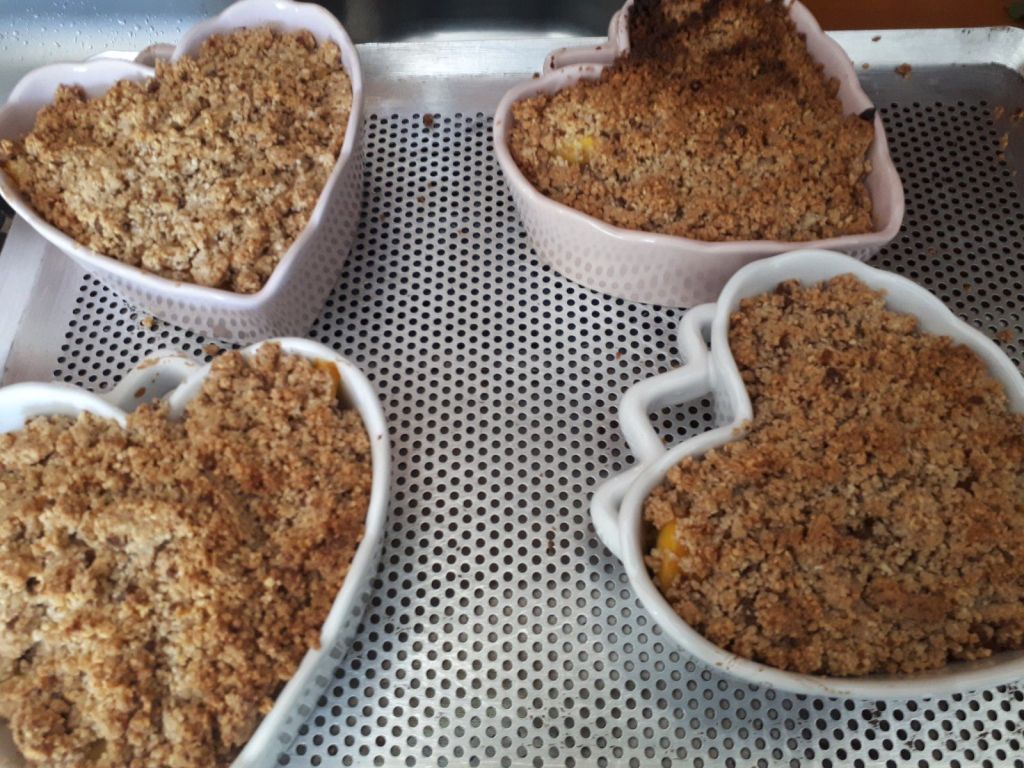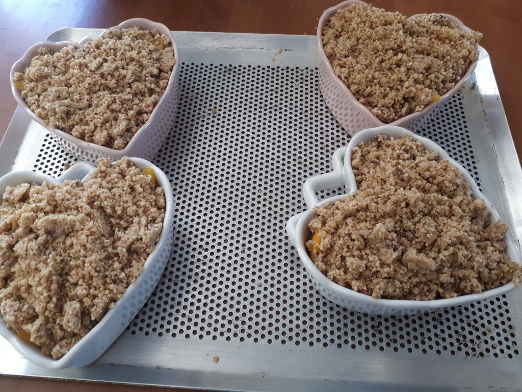 - Dans un saladier verser la farine, la poudre d’amande, la vanille ainsi que le sucre, ajouter le beurre coupé en morceaux et travailler votre pâte du bout des doigts, une fois la pâte granuleuse la parsemer sur les fruits.