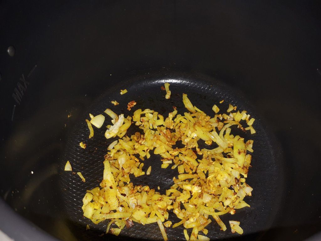 - Mettre votre Cookéo en mode dorer, déposer 2 c à s d’huile, l’oignon épluché et ciselé, la gousse d’ail hachée puis faire dorer 2 minutes. Ajouter 1 c à s de poudre de cari puis laisser dorer 1 minute en mélangeant.