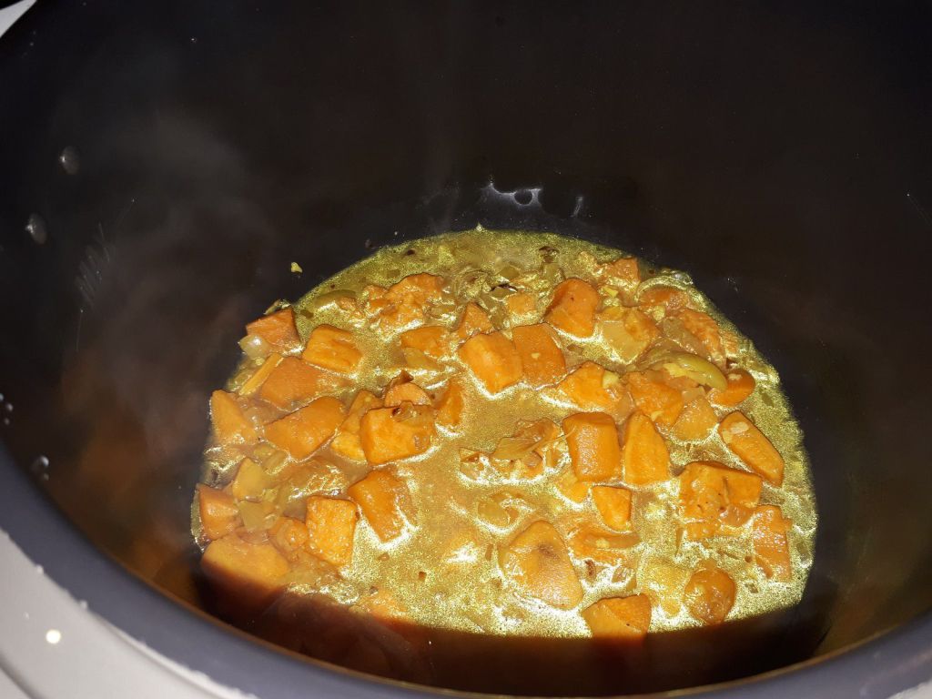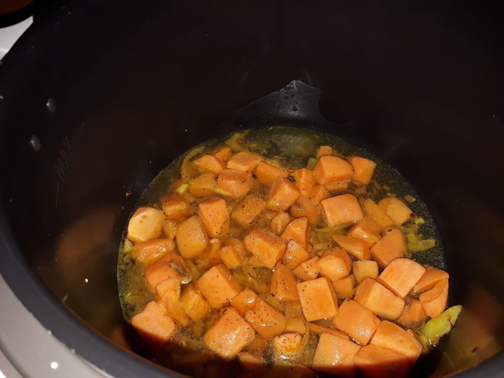 - Ajouter les patates douces épluchées et coupées en dés, recouvrir avec l’eau puis passer en mode sous pression pour 3 minutes.