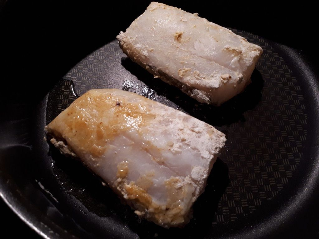 - Tremper les dos de cabillaud dans le lait de coco, puis dans le mélange de farine. Bien enrober de farine et secouer pour enlever l’excédent.
