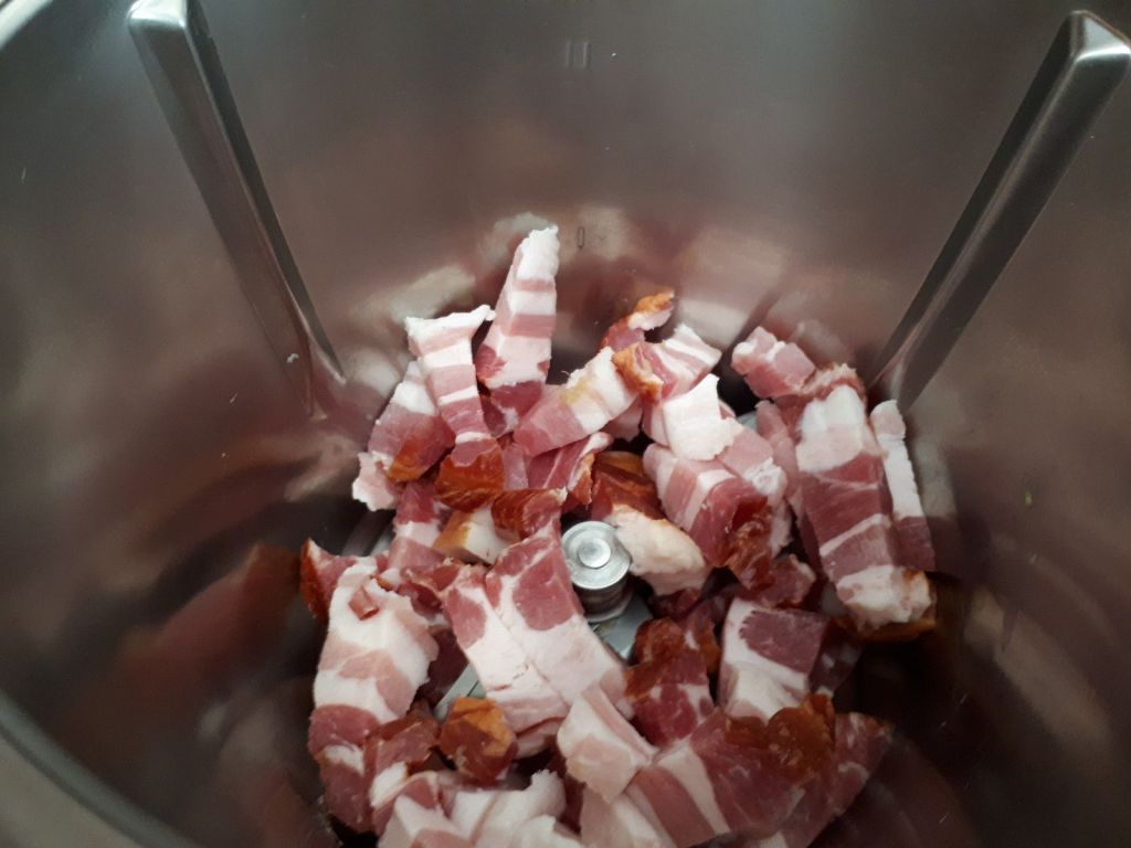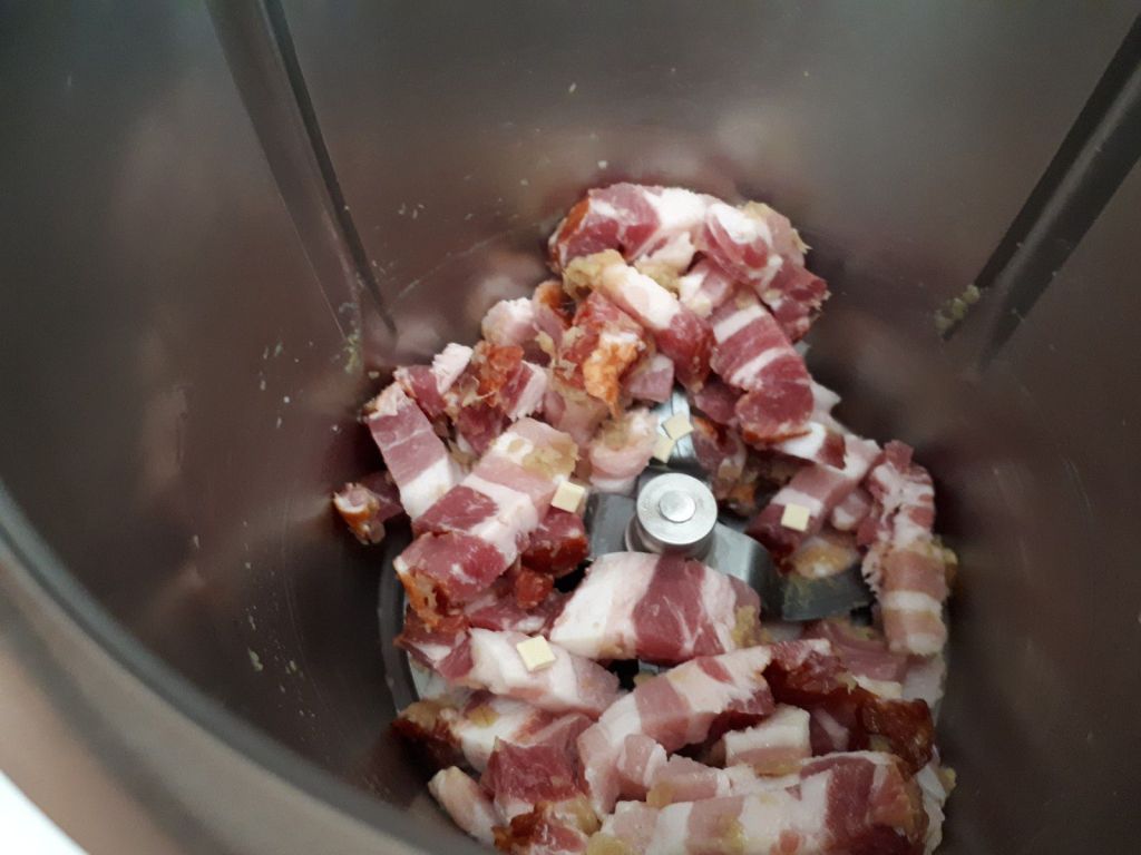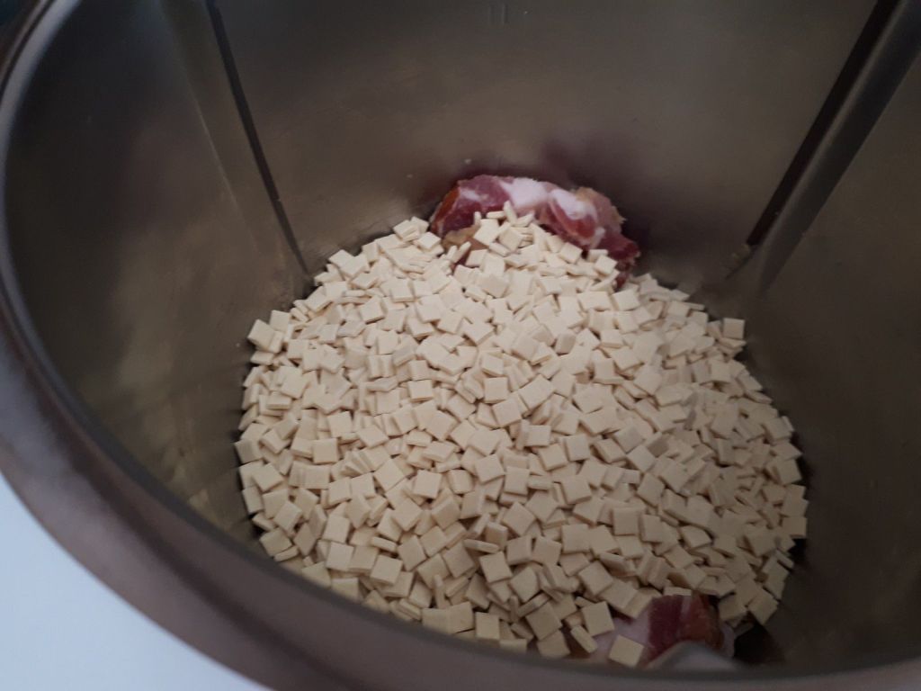 - Éplucher votre oignon, le couper en 2, le mettre dans le bol et mixer 5sec/vit5, racler votre bol. Ajouter votre poitrine coupée en lardons et faire revenir 4 min/100°C/sens inverse/vit mijotage.