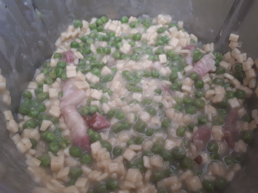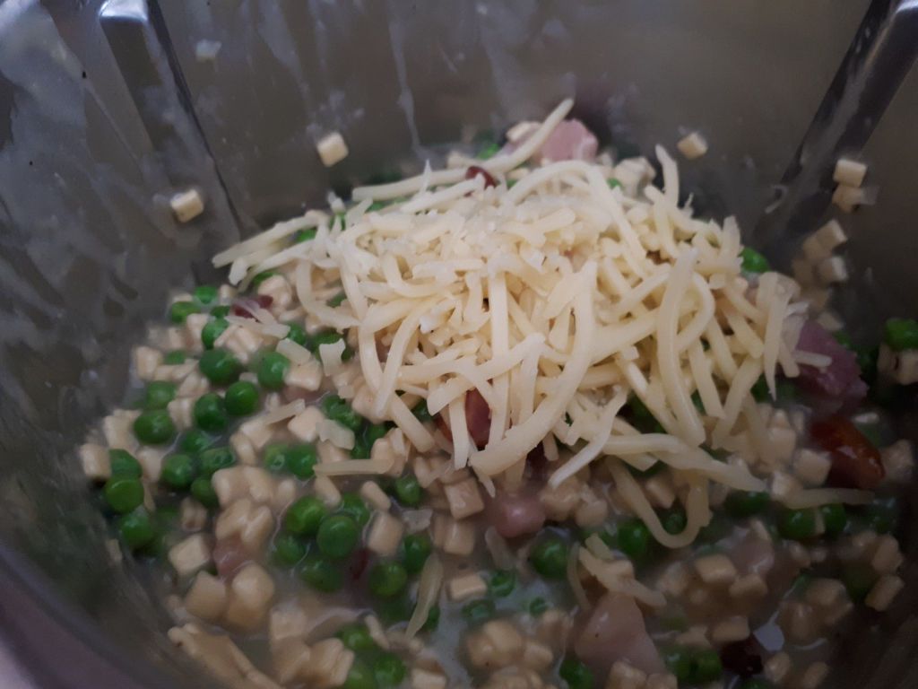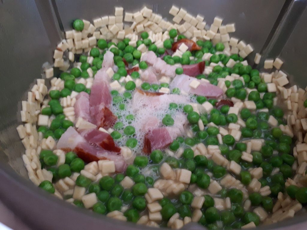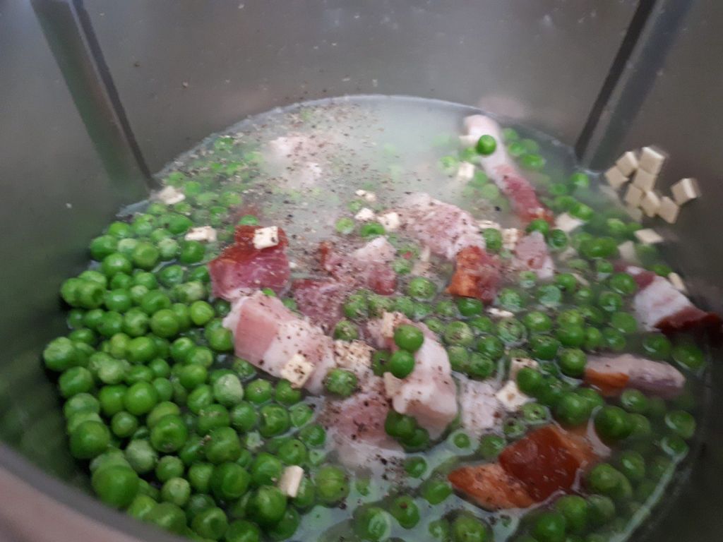 - Au bout de ce temps, ajouter le bouillon et les petits pois, mélanger puis programmer 15 minutes/100°C/sens inverse/vitesse mijotage.