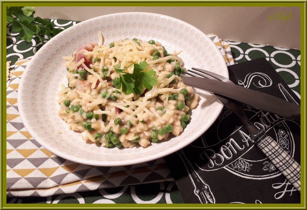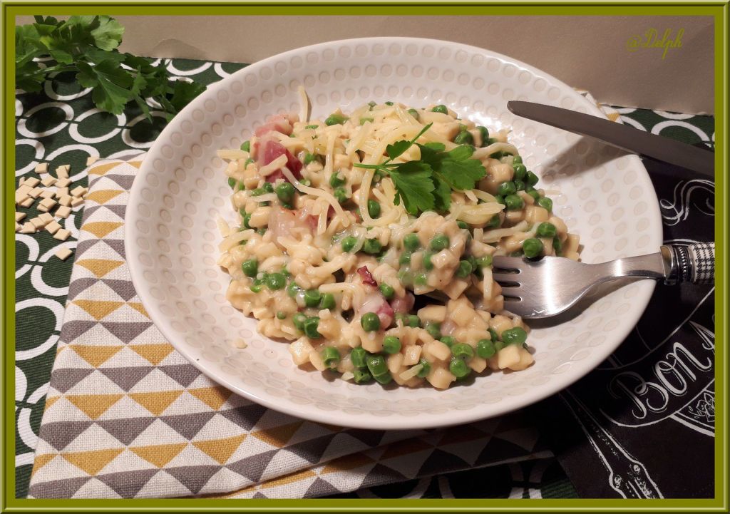 J’avais déjà réalisé un crozetto aux lardons et poivrons, nous nous étions régalés..Cette fois-ci, j’ai mis des petits pois, j’en avais dans mon congélateur et je suis en train de le vider. J’ai mis du bon Comté que notre famille Jurassienne nous rapporte, c’est juste un régal…