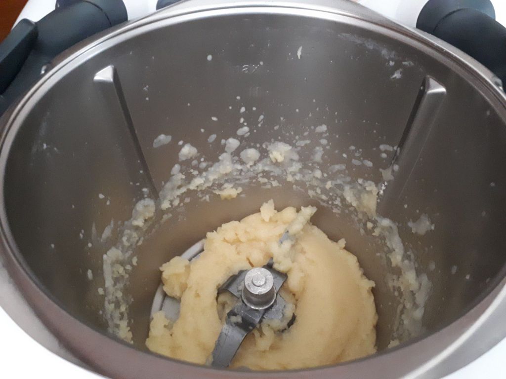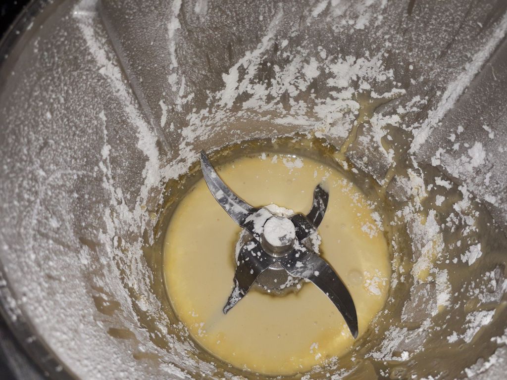 - Ajouter la farine et mixer 1min30sec/Vit3, puis laisser le bol ouvert quelques minutes pour laisser la pâte refroidir un peu.