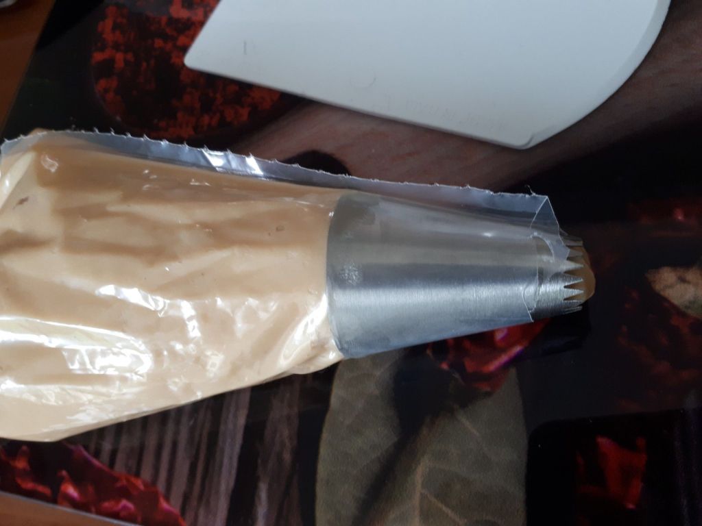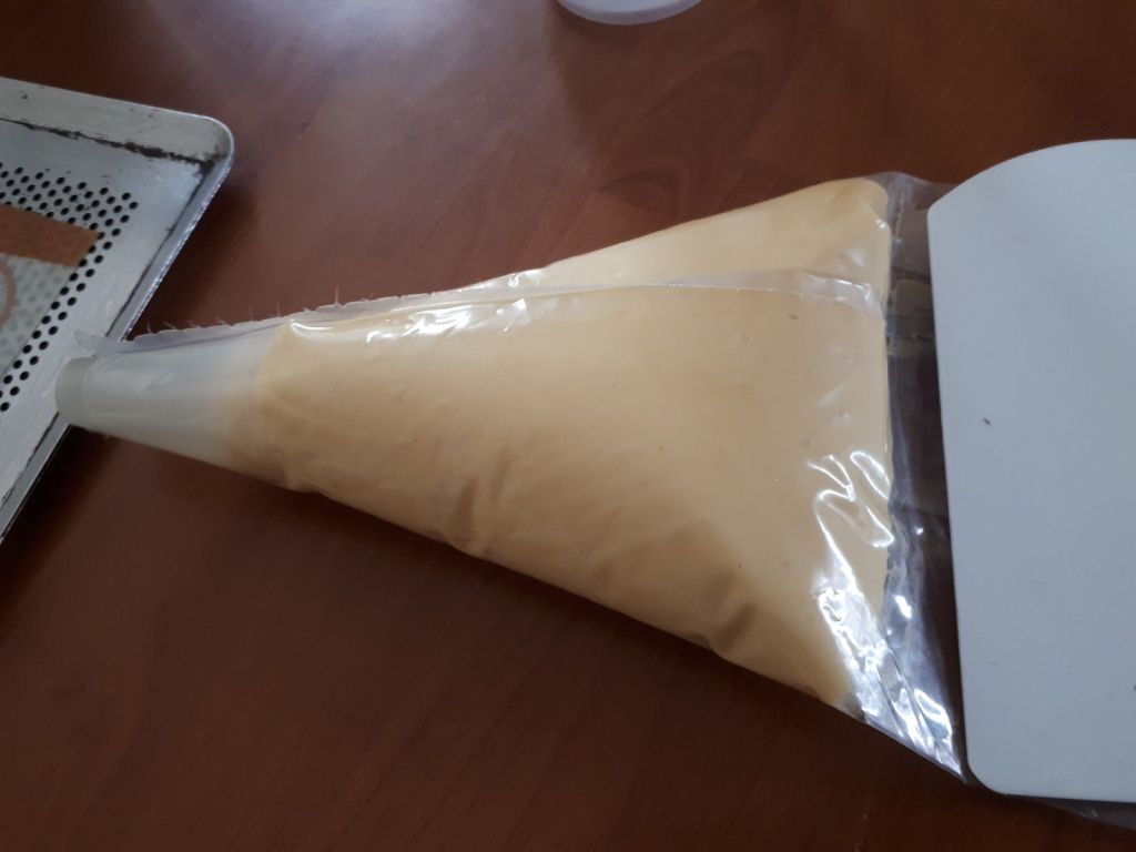 - Lorsque tout est bien froid, vous pouvez remplir vos éclairs, mettre votre crème au caramel dans votre poche à douille, utiliser une douille très fine 1cm puis remplir par le derrière de l’éclair à trois endroits. (Aux deux extrémités et au milieu).