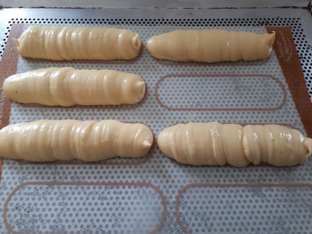 - Recouvrir la plaque du four d’une feuille de papier sulfurisé et couchez-y, à l’aide d’une poche à grosse douille lisse de 8 cm de diamètre, d’épais bâtonnets de pâte de 6 à 7 cm de long, bien espacés les uns des autres.