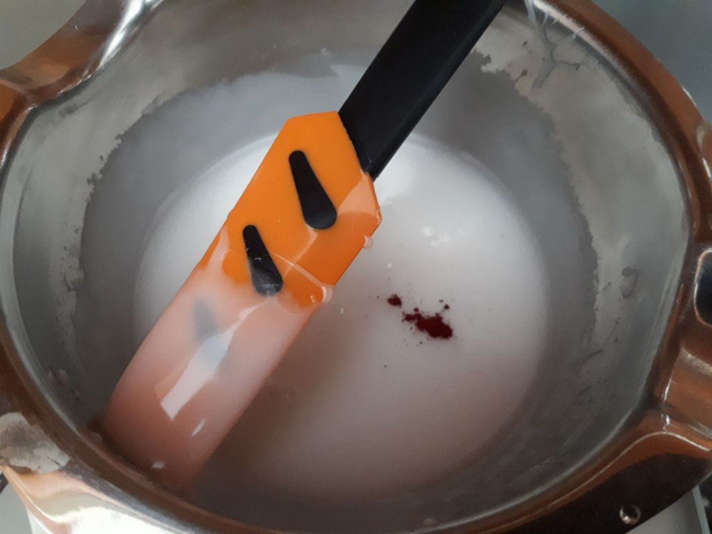 - Utiliser votre fondant pour le glaçage, le faire fondre au bain-marie à 35°C, bien mélanger et mettre une pointe de couteau de colorant, puis tremper votre éclair d’un bord à l’autre.