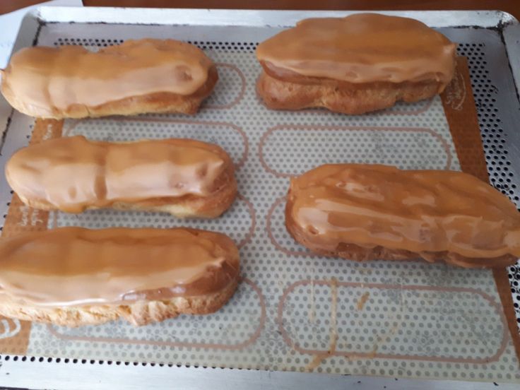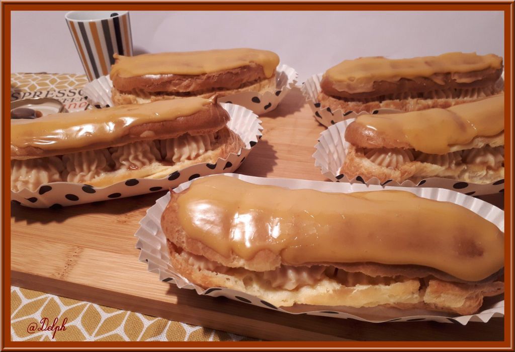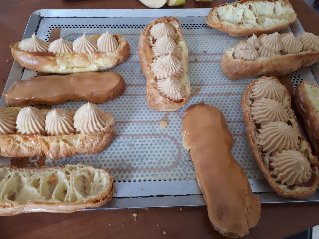 Voici donc son dessert, les éclairs sont un peu trop gros, mon pochage n’est pas régulier, donc pas très esthétiques mais il a adoré, c’est le principal pour moi.. J’ai utilisé un pot de « Crème petits biscuits au gout caramel beurre salé « qu’une gentille maman d’élève m’a offert pour remplacer le caramel beurre salé.