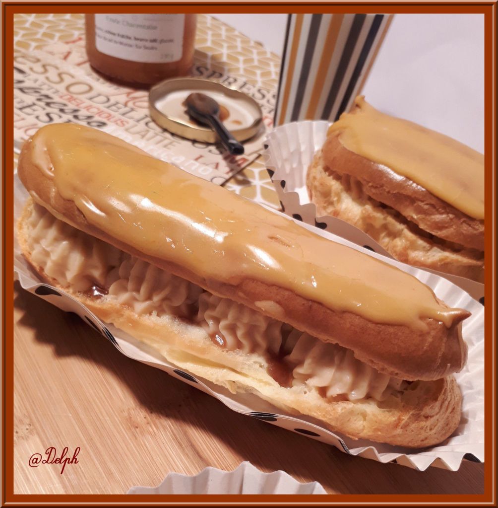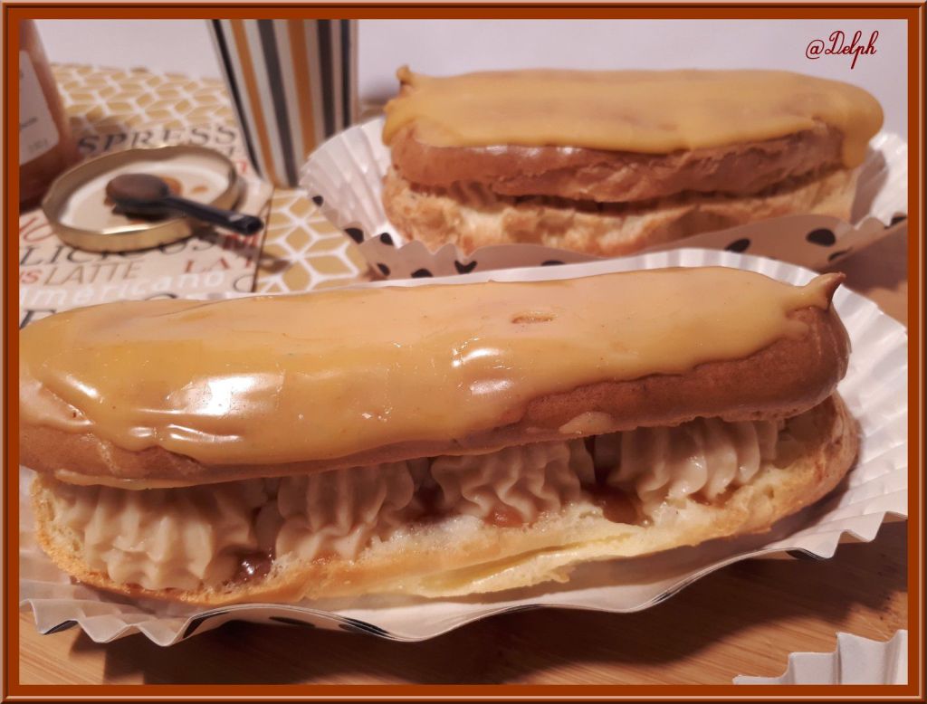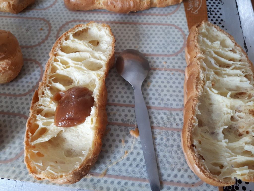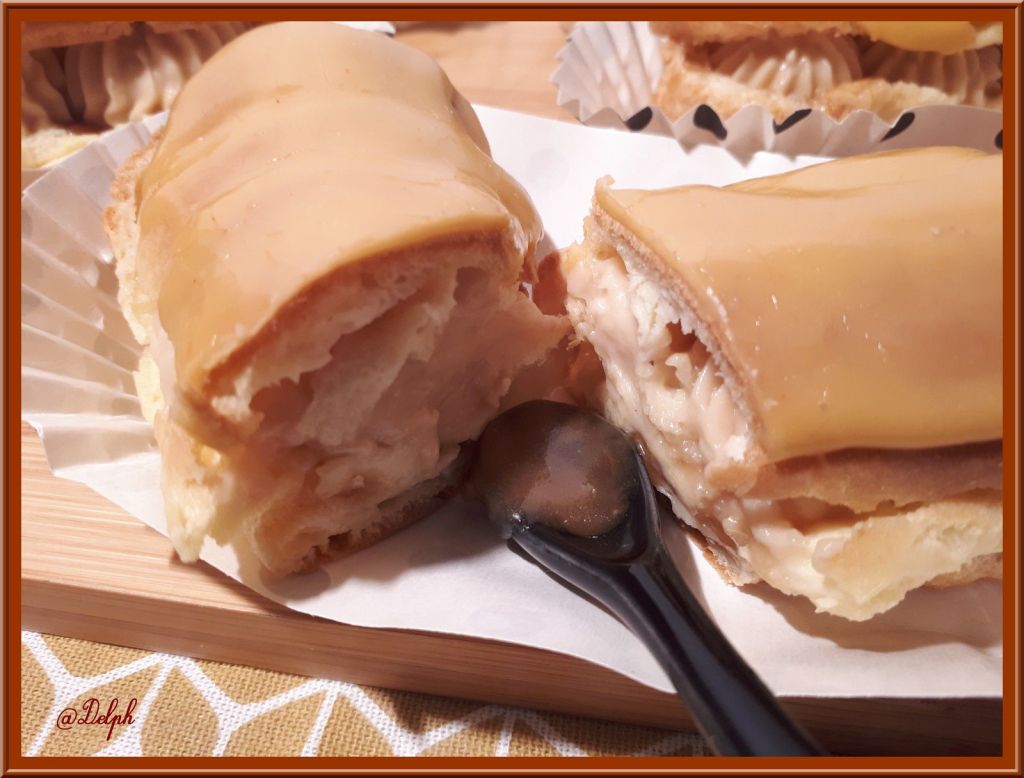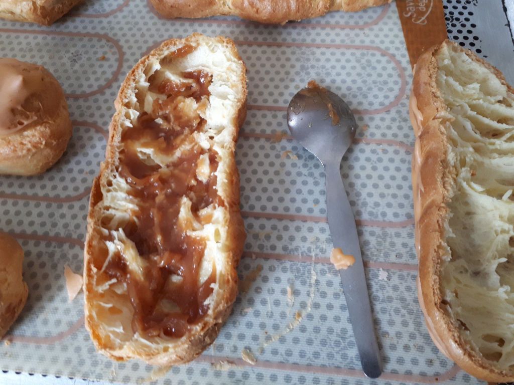 - Vous pouvez aussi couper votre éclair en deux dans le sens de la longueur pour les garnir, j’ai utilisé une douille cannelé, j’ai pu ainsi mettre une fine couche de caramel beurre salé au fond pour que cela soit plus gourmand, avant de pocher la crème..
