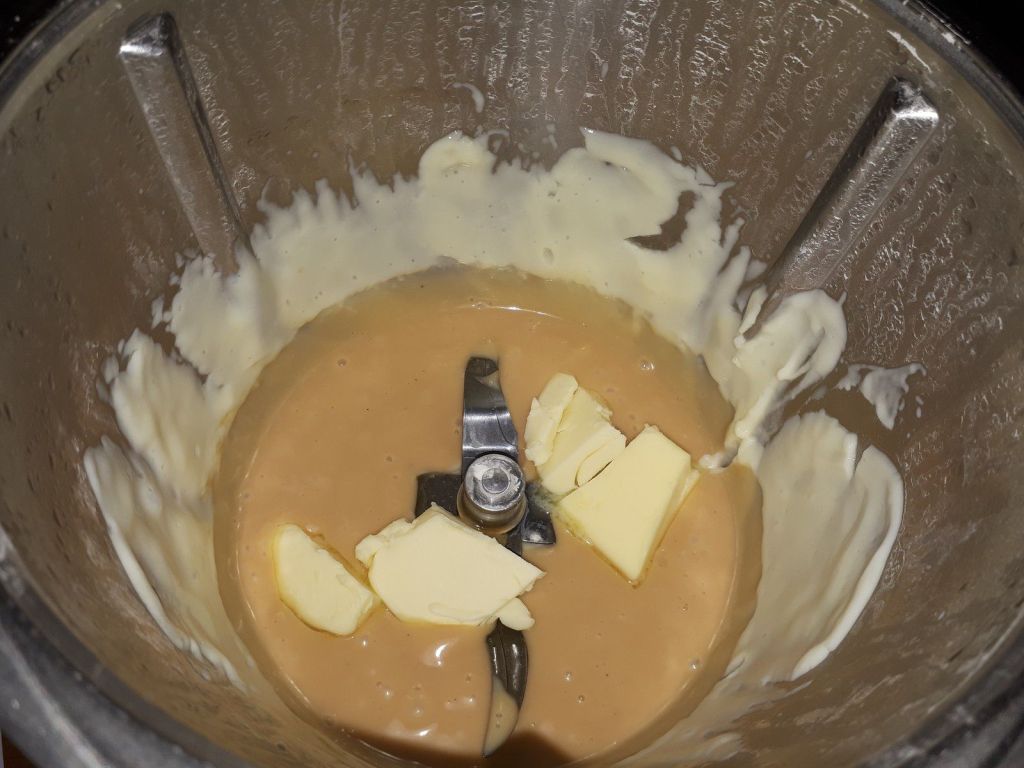 - Ajouter enfin le beurre froid en cubes, et mixer pour émulsionner. Filmer au contact et réserver au frigo.