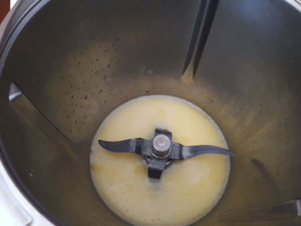 - Mettre le beurre, le sel, l’eau et le lait dans le bol et chauffer 4min/100°C/vit1. (Si vous divisez les doses faire 3min30/100°C/ vit 1 avec du lait froid, mais je vous conseille de rester à côté.)