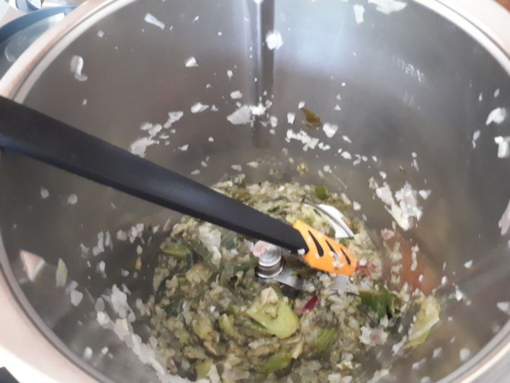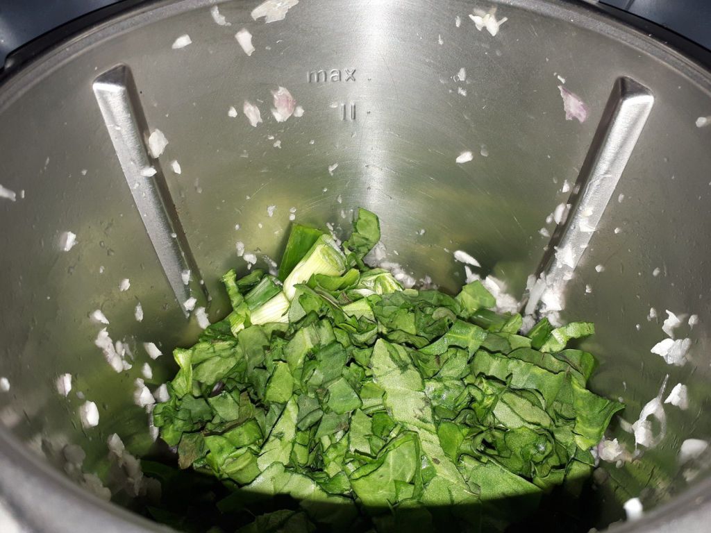 - Ajouter l’huile d’olive puis les feuilles d’oseille coupées en lanières et les fanes des oignons coupées en petits tronçons, faire revenir l’ensemble 3min/varoma/vit mijotage. Prolonger la cuisson 2min/100°/ Vit mijotage. Réserver, inutile de rincer le bol.