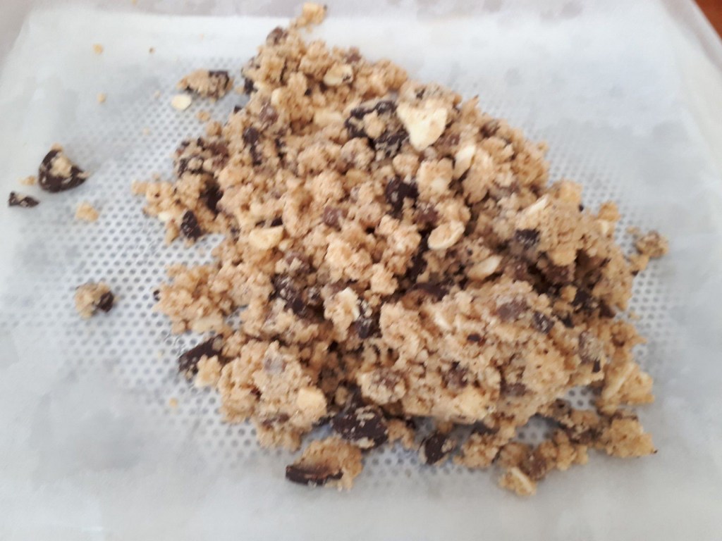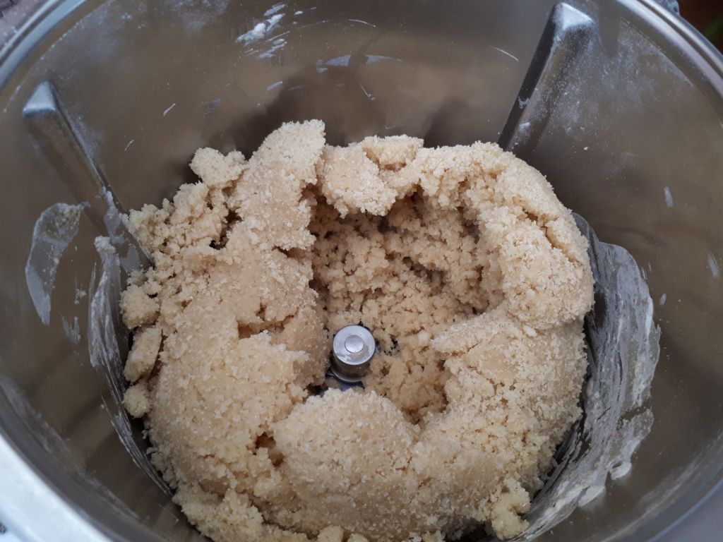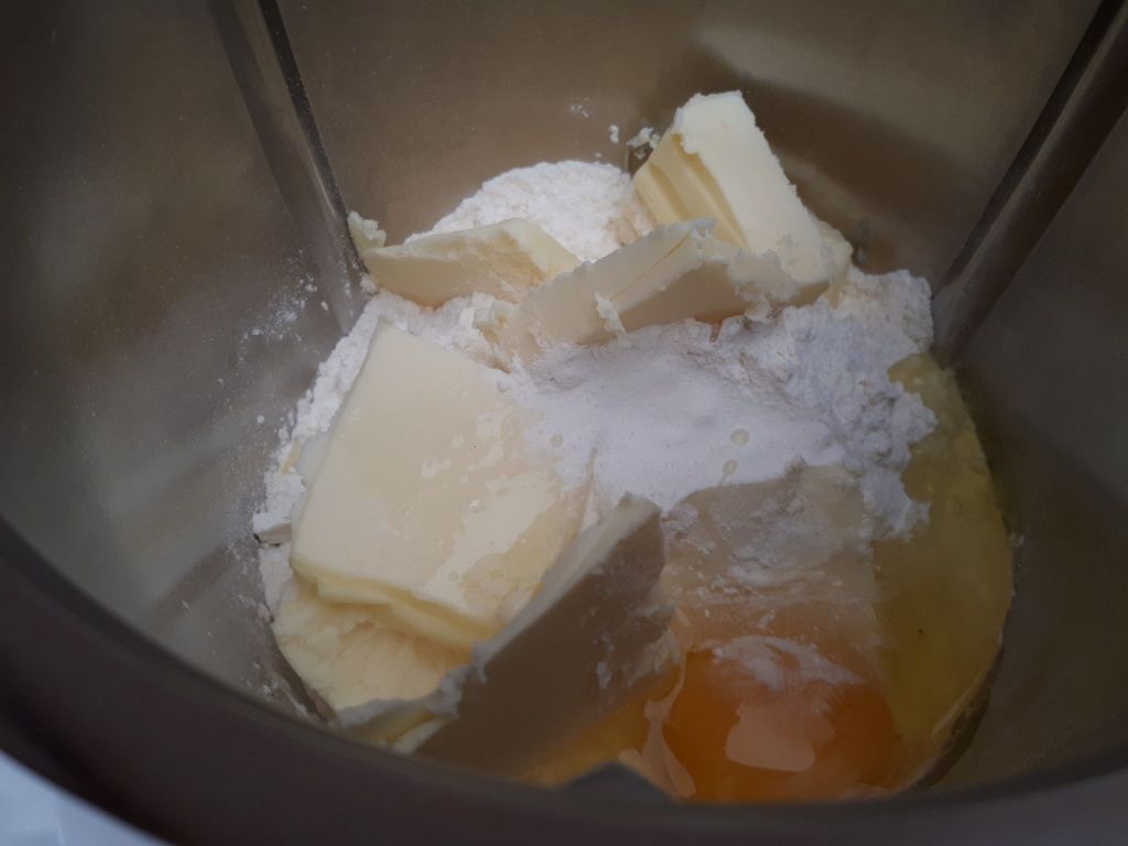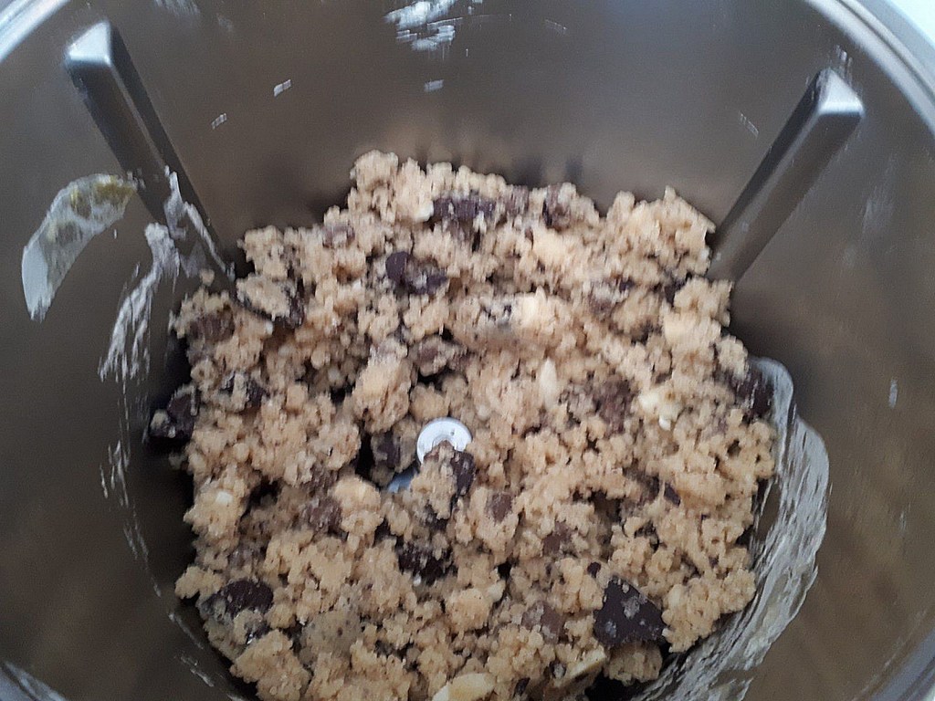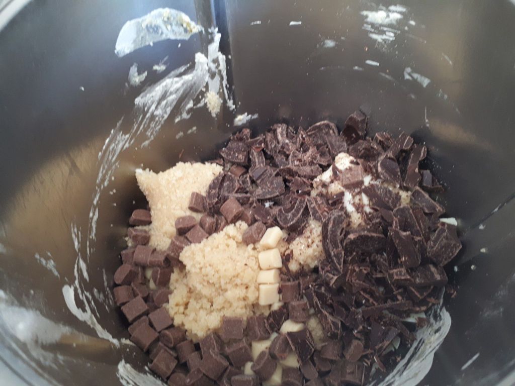 1. Mettre dans le bol, les deux sucres, la farine et la levure, ajouter ensuite le beurre puis l’œuf puis mélanger 1min30/vit 3, ajouter les chocolats et mettre en mode pétrin pour 40sec.
