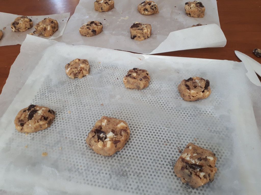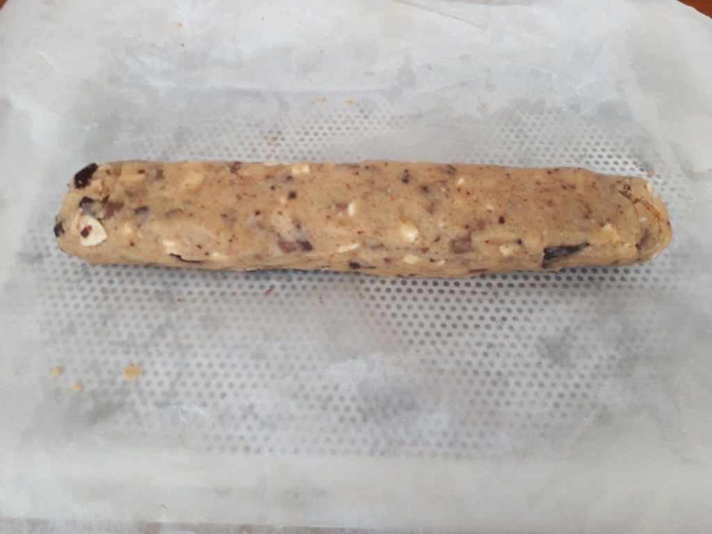 J’ai réalisé la pâte nature puis après je l’ai divisé en deux pour avoir deux tournées de cookies avec des goûts différents, j’ai donc mis pour la moitié de la pâte 65 g de chaque chocolat. A savoir aussi que vous pouvez garder votre boudin de pâte dans votre réfrigérateur jusqu’à 3 jours avant de les faire cuire.
