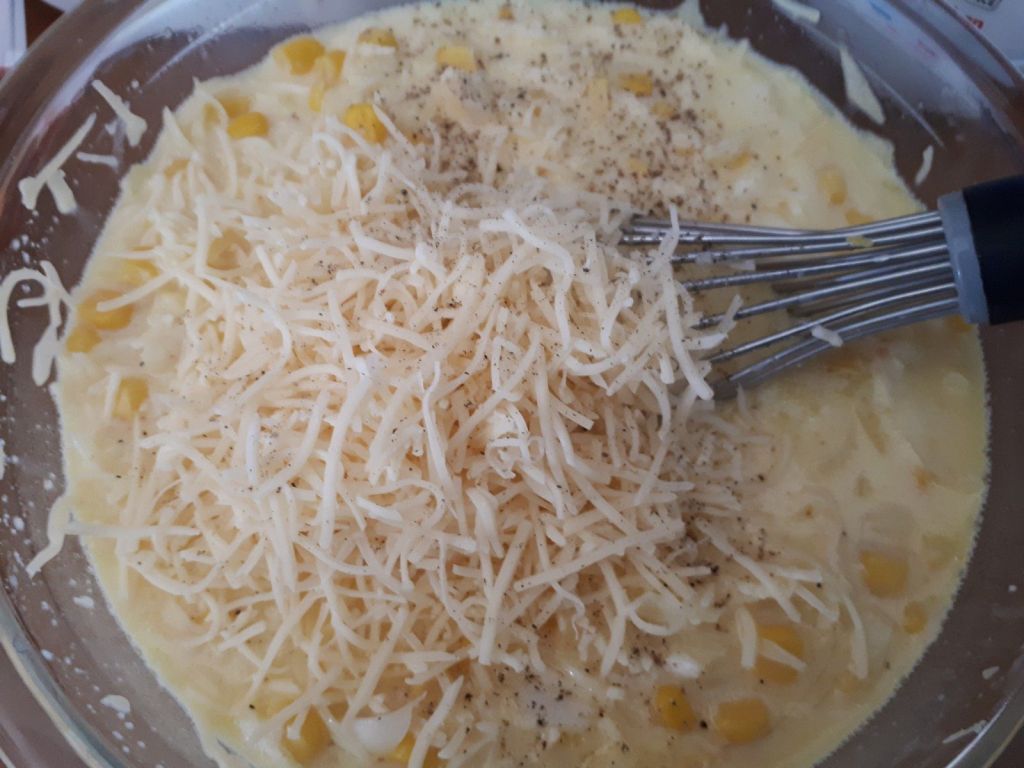 - Dans un grand saladier, mélanger les oignons hachés, l’huile d’olive et le gros sel. Incorporer le maïs rincé et bien égoutté, le fromage, les œufs préalablement battus et enfin le lait.