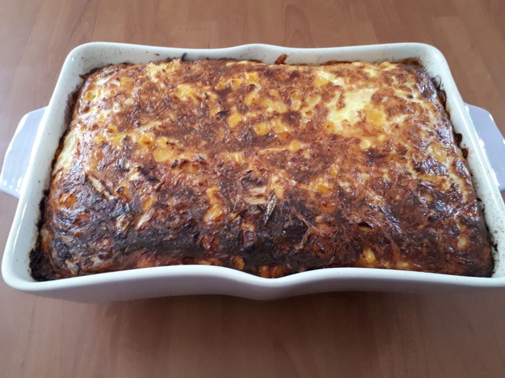 La chipa-guazù est un gâteau à base de grains de maïs et l’une des 70 variétés de «chipa», un aliment qui est traditionnel au Paraguay. J’ai trouvé plusieurs recettes de ce gâteau salé, avec des préparations différentes, l’une ou il fallait faire revenir l’oignon et hacher le maïs, et l’autre où il ne fallait pas faire revenir l’oignon et laisser les maïs en grains. J’ai choisi la deuxième option, et nous avons beaucoup apprécié que les maïs reste un peu croquants..Vous avez les deux options à vous de choisir.