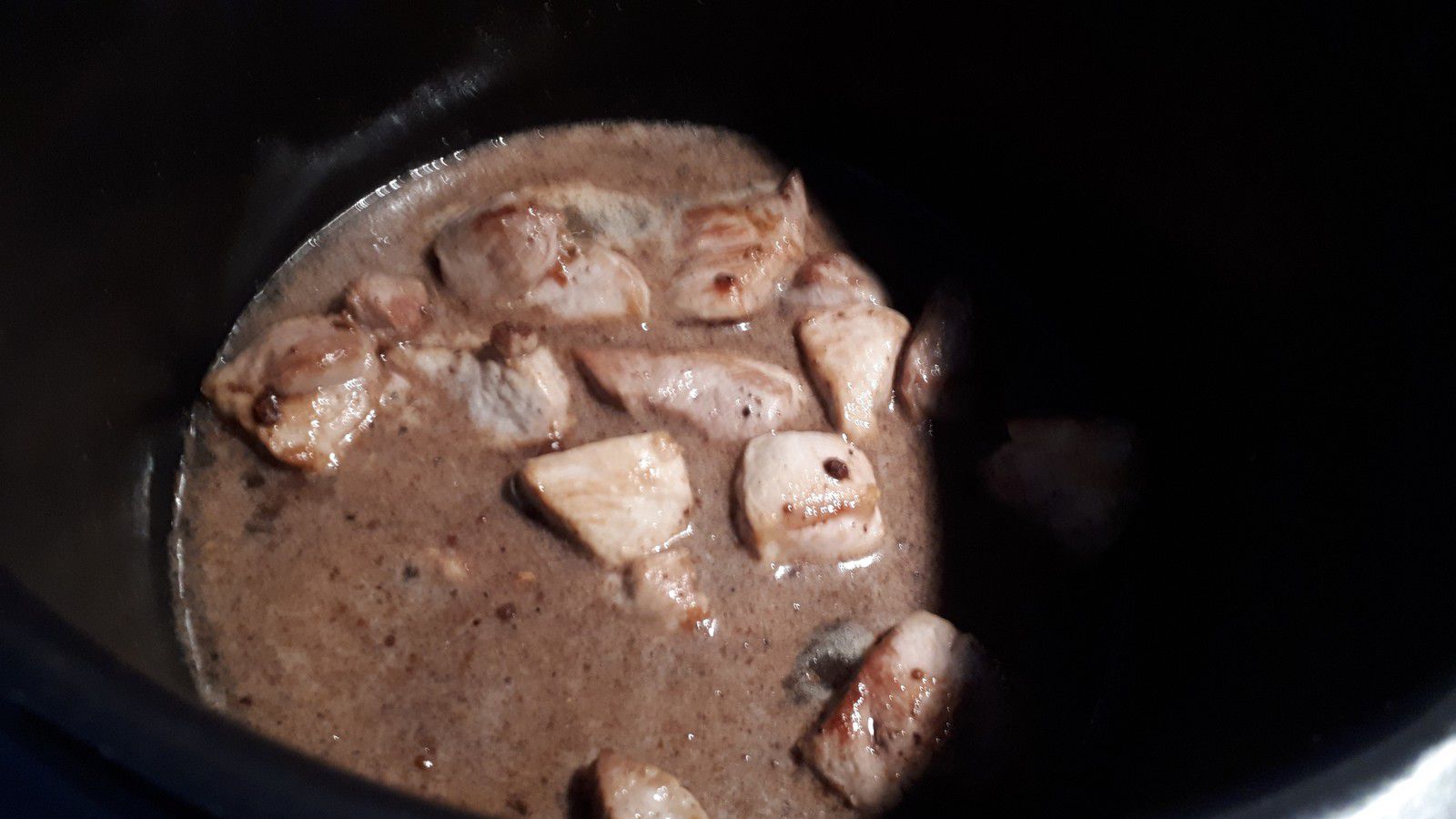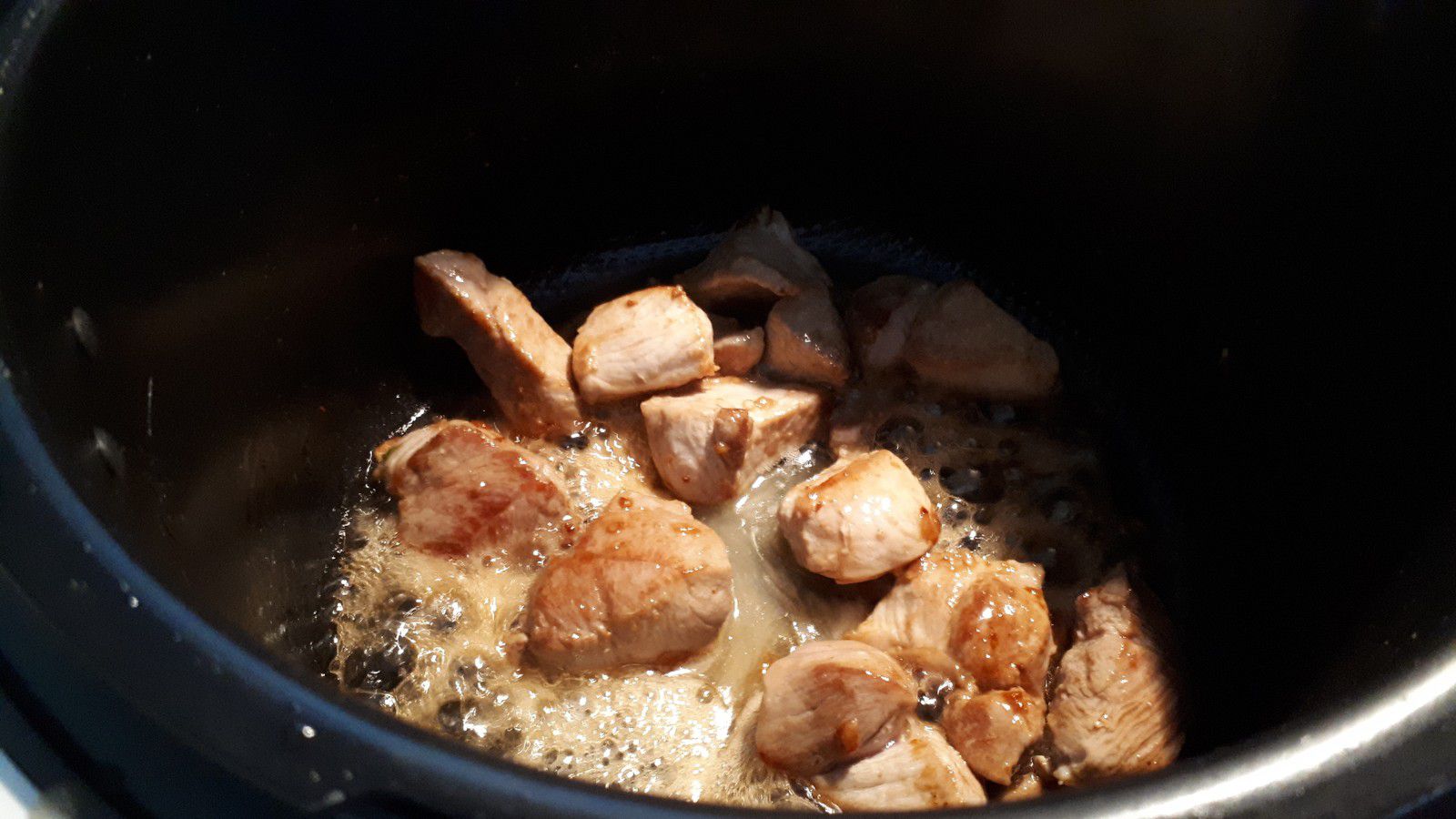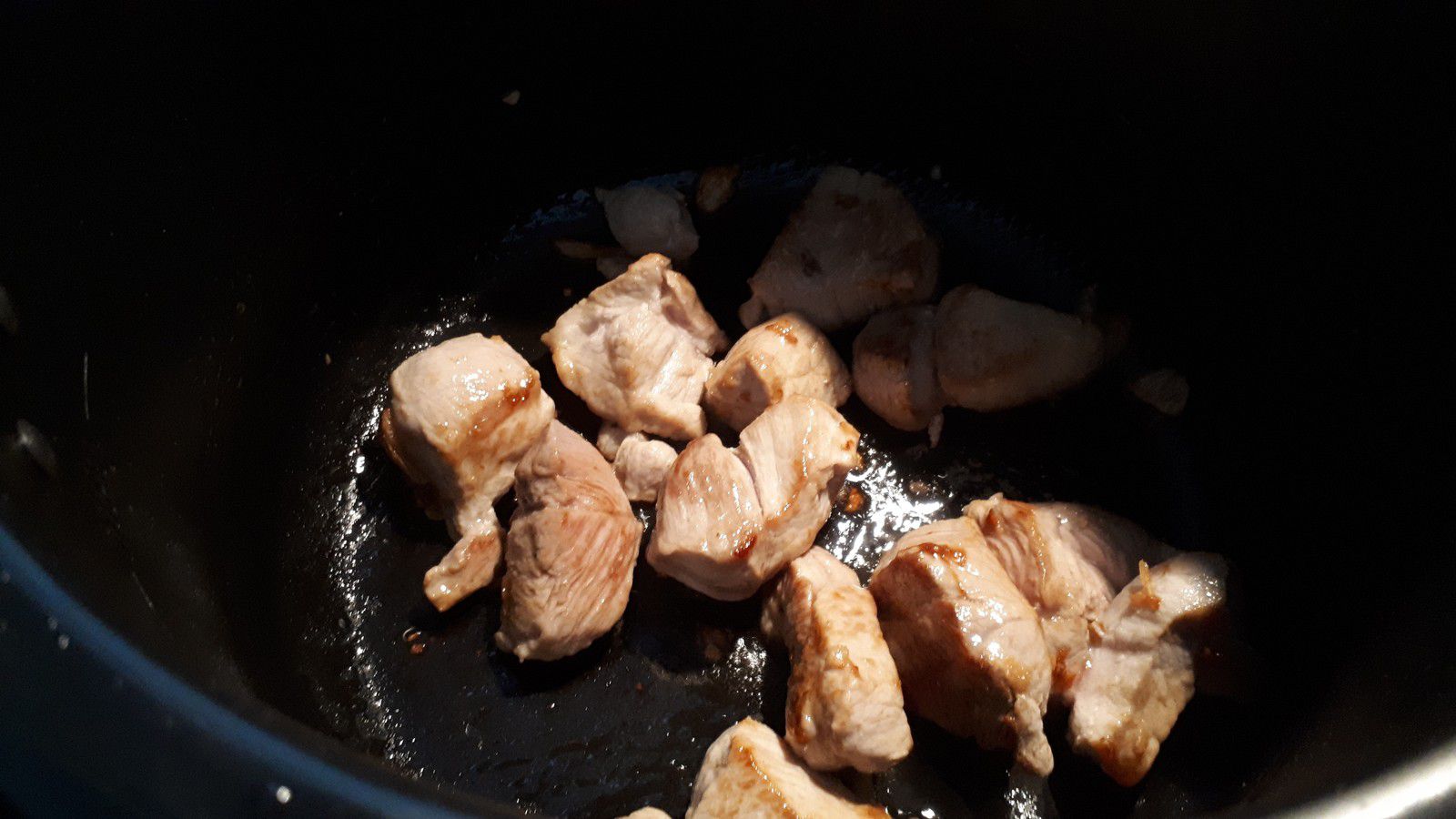 - Mettre le Cookéo en mode dorer, verser l’huile; ajouter l’ail et le porc faire dorer 4 minutes. Incorporer le miel et laisser chauffer 2 minutes en mélangeant.