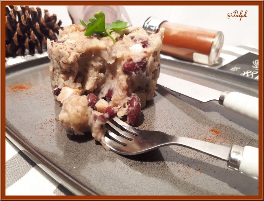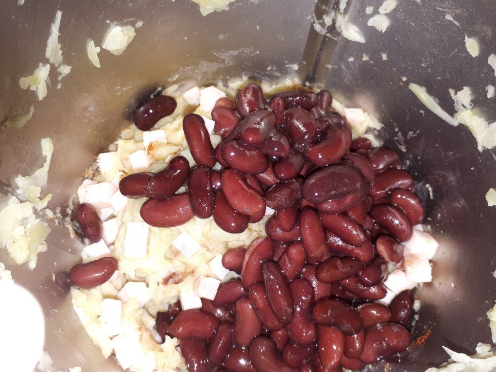 - Faire chauffer l’huile, y faire cuire l’oignon pour simplement l’ attendrir. Piler les pommes de terre et verser les haricots rouges au-dessus. Mélanger bien le tout. Ajouter l’oignon cuit, les dés de poulet fumé assaisonner avec le piment, du sel, et du poivre, mélanger.