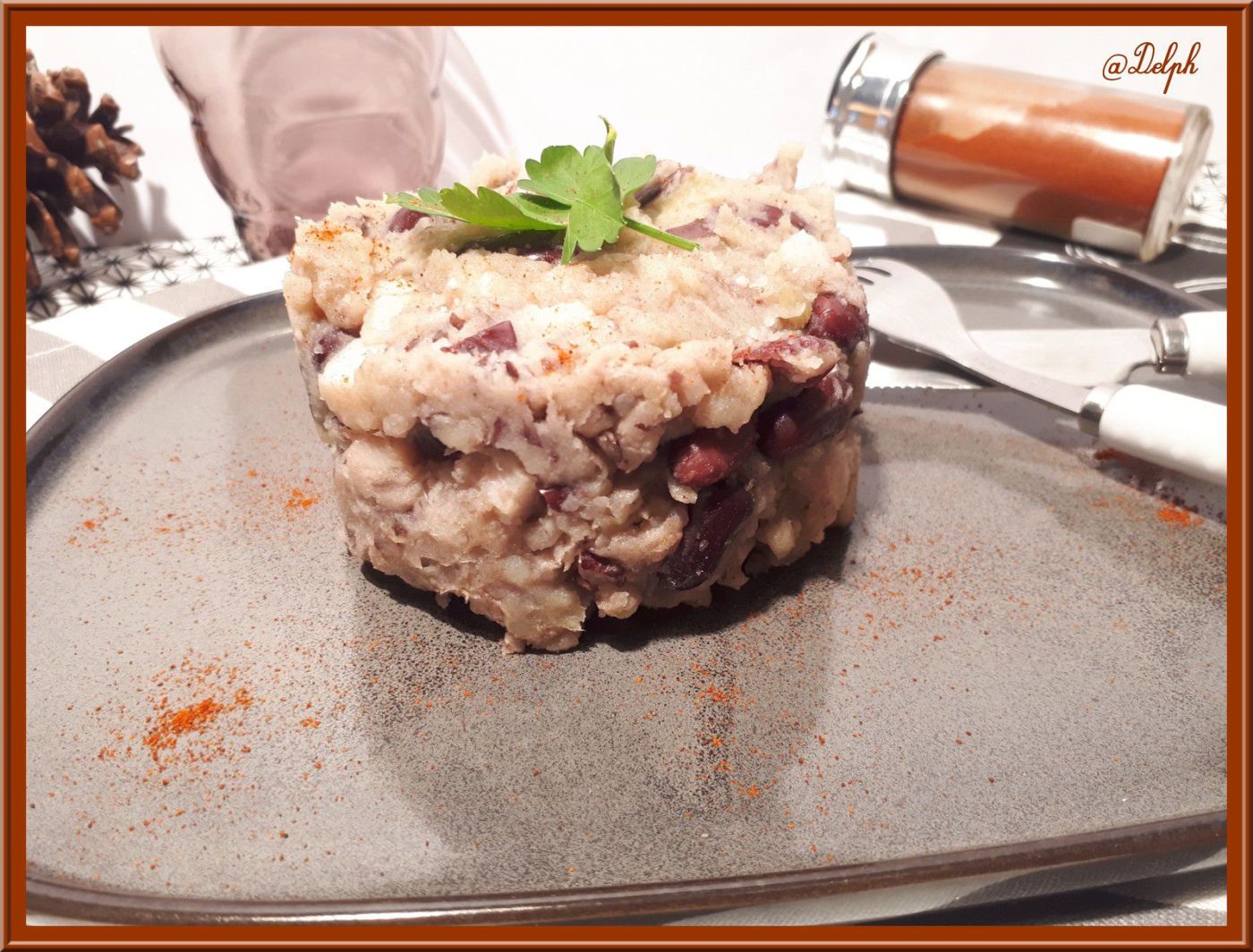 - Faire chauffer l’huile, y faire cuire l’oignon pour simplement l’ attendrir. Piler les pommes de terre et verser les haricots rouges au-dessus. Mélanger bien le tout. Ajouter l’oignon cuit, les dés de poulet fumé assaisonner avec le piment, du sel, et du poivre, mélanger.