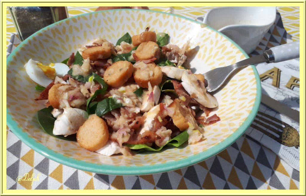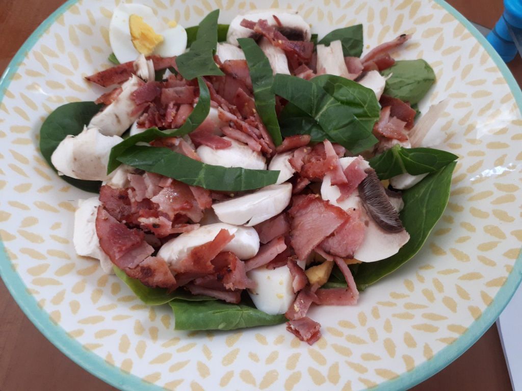 - Placer les épinards dans un grand bol à salade et garnir d’œuf haché, de bacon émietté, de croûtons et de champignons; arroser de vinaigrette et mélanger.