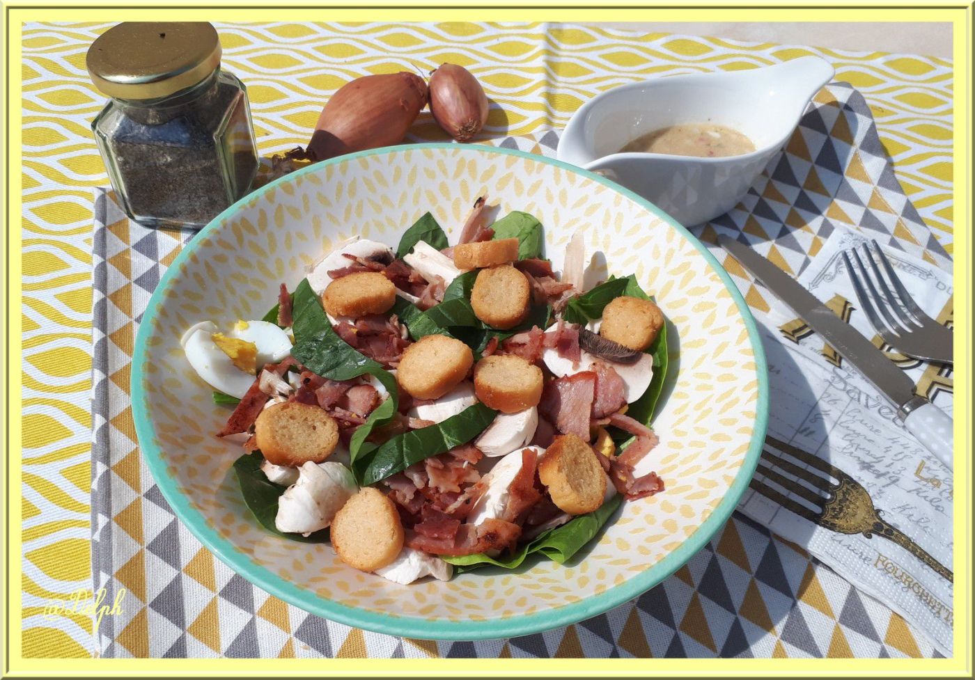 - Placer les épinards dans un grand bol à salade et garnir d’œuf haché, de bacon émietté, de croûtons et de champignons; arroser de vinaigrette et mélanger.