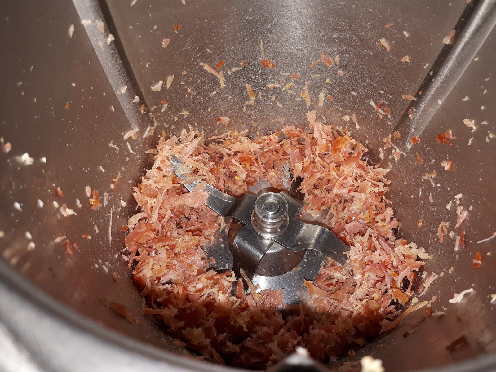 - Mettre le jambon dans le Thermomix et mixer 5sec/vit5, réserver. Inutile de rincer le bol.