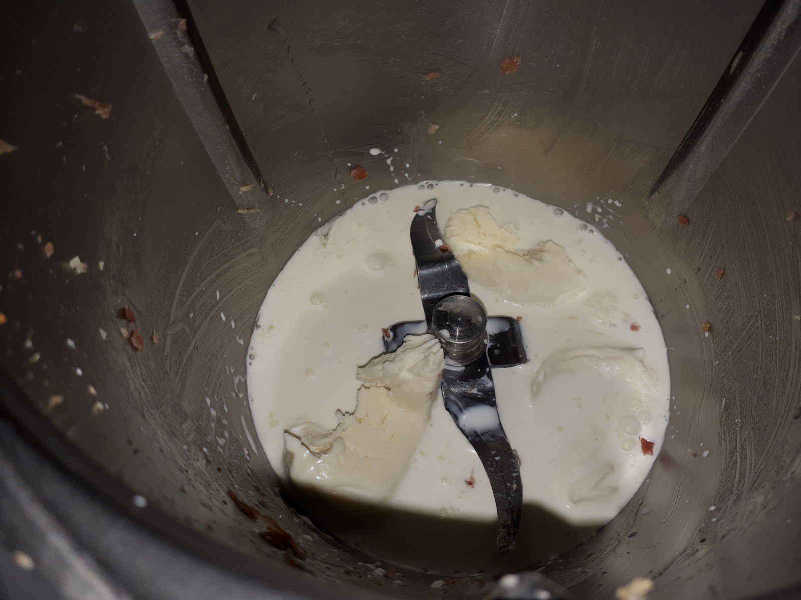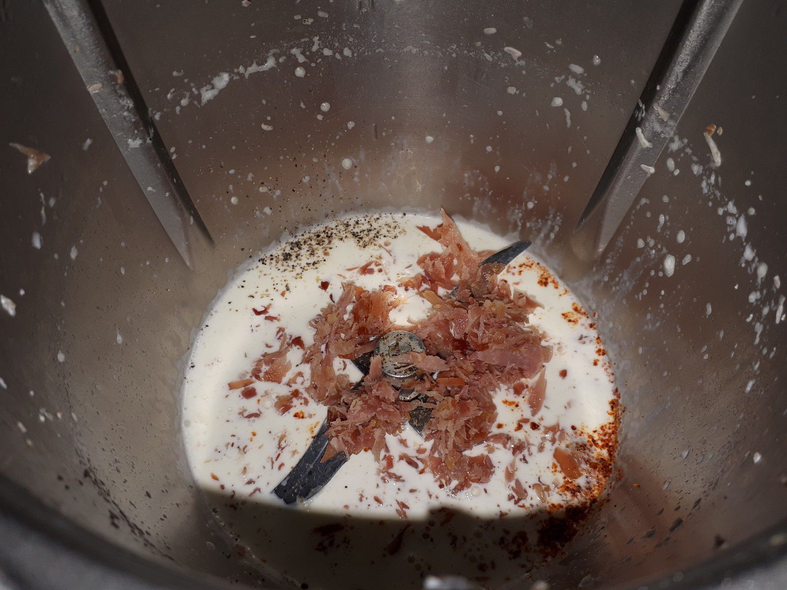 - Mettre la crème et la mozzarella coupée en morceaux dans le bol et faire chauffer 3min/80°/vit2, puis mixer 5sec/vit5.