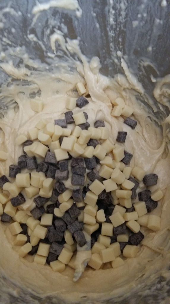 - Homogénéiser rapidement la pâte, sans trop la travailler, puis ajouter enfin les chunks de chocolat.