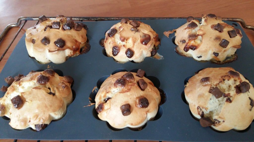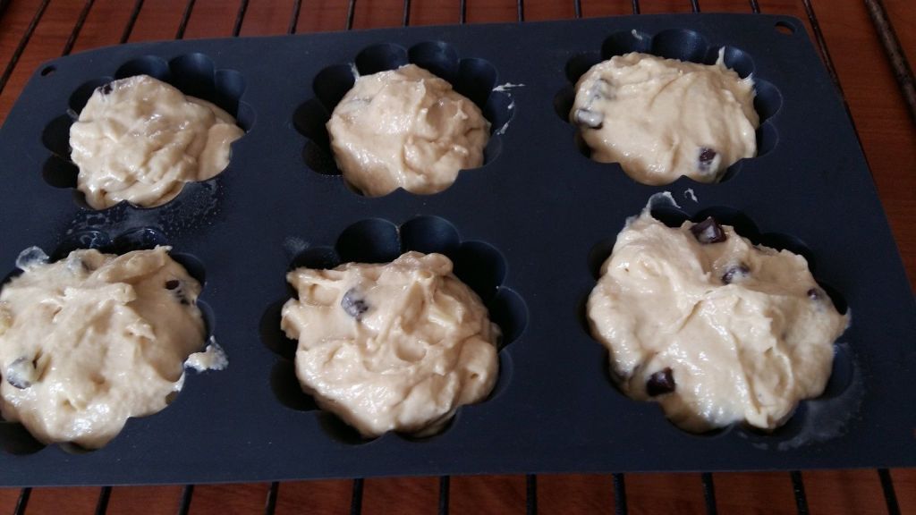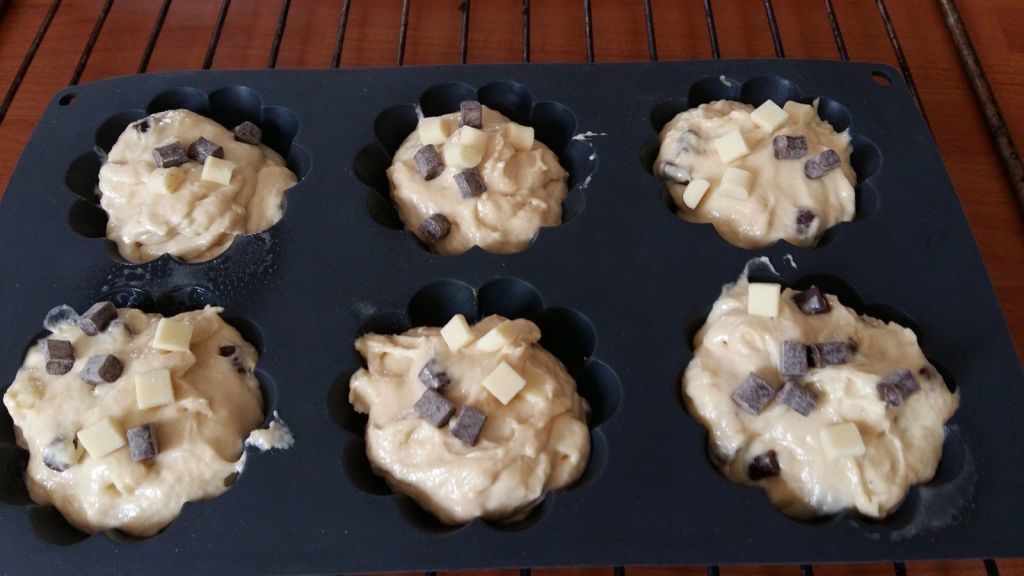 - Verser la pâte dans 6 moules à briochettes ou 6 moules à muffins, parsemer de quelques chunks.
