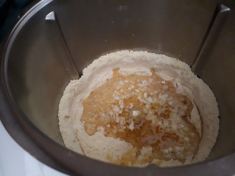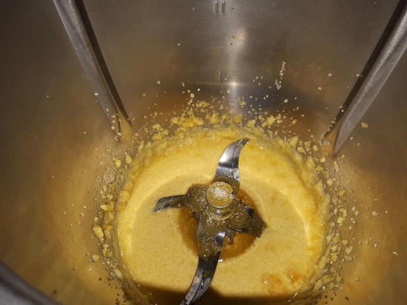 - Mettre les jaunes et le sucre dans le bol puis mélanger 1 min/vit3, ajouter les farines mélanger 30sec/vit3.