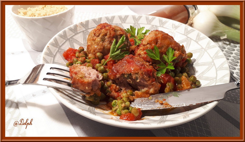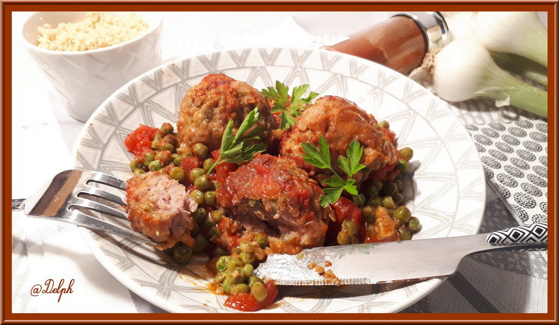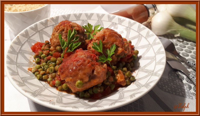 - Faire revenir vos boulettes quelques minutes dans de l’huile bien chaude, les retourner délicatement, ajouter les tomates et les petits pois, couvrir et faire revenir sur feu moyen une vingtaine de minutes. Jusqu’à ce que les petits pois soient bien cuits.