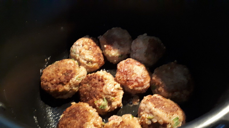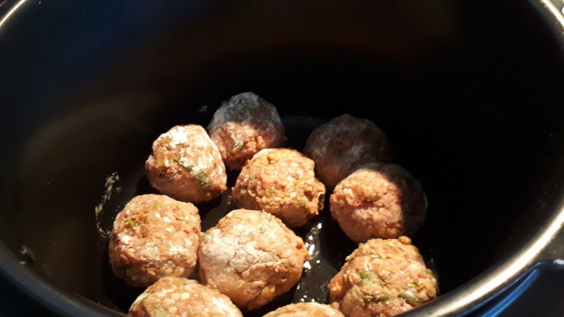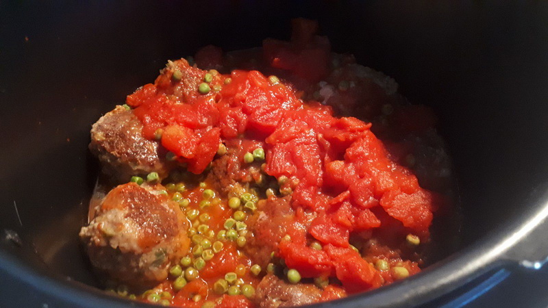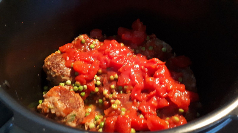 - Dans le Cookéo sur le mode dorer, faire revenir les boulettes dans l’huile chauffée pendant 4 minutes, en les retournant délicatement. Ajouter les tomates et les petits pois, assaisonner.
