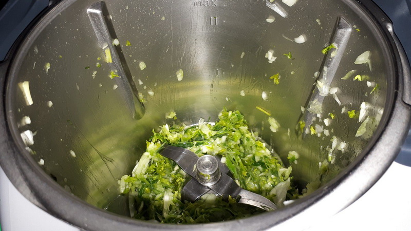 - Couper, oignon en deux, couper la tige et mettre le tout dans le bol avec les feuilles de persil, mixer 5sec/vit5, racler les bords, mixer à nouveau 5sec/vit5.