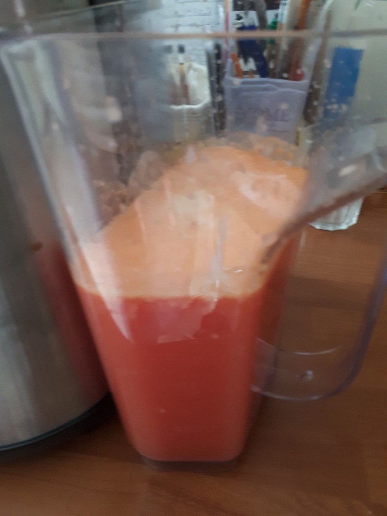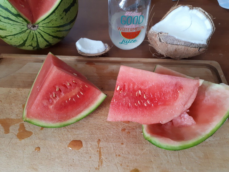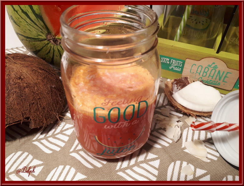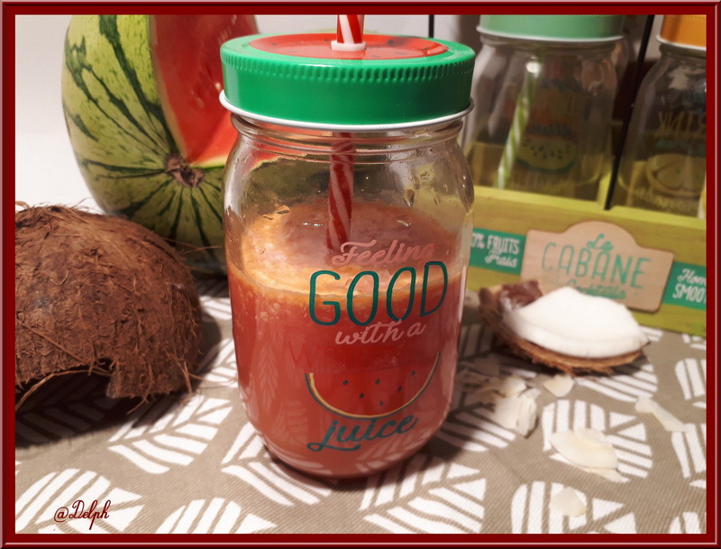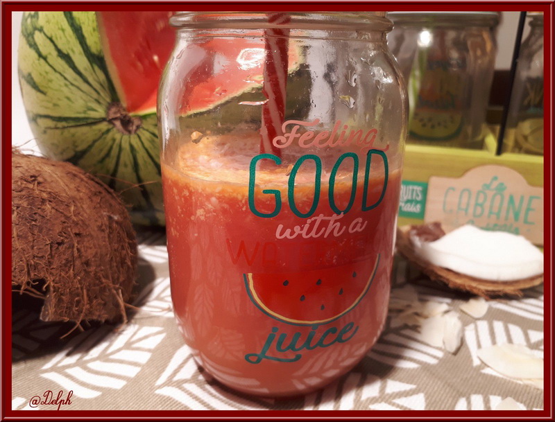 - Mettre dans votre extracteur, la pastèque , la chair et l’eau de coco. Mettre dans une carafe, ajouter le jus de citron.