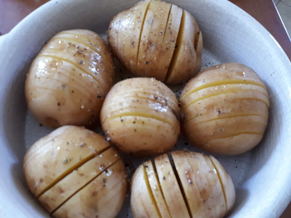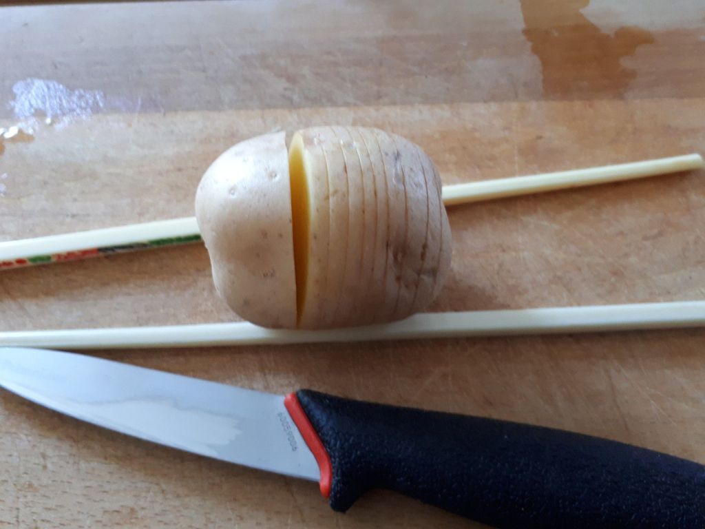 - Couper les pommes de terre tous les 3 mm sans les trancher jusqu’au bout, les caler avec des baguettes chinoises pour que cela soit plus facile.