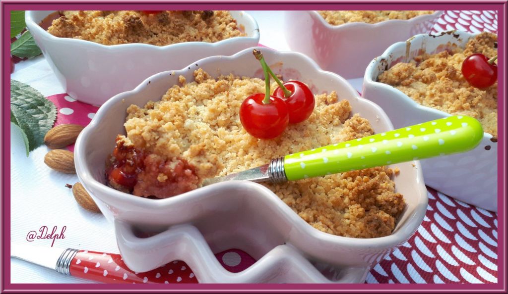 Toujours avec la récolte de mes cerises, voici un délicieux crumble, un dessert que mon mari adore. Je lui décline avec différents fruits et il se régale à chaque fois.