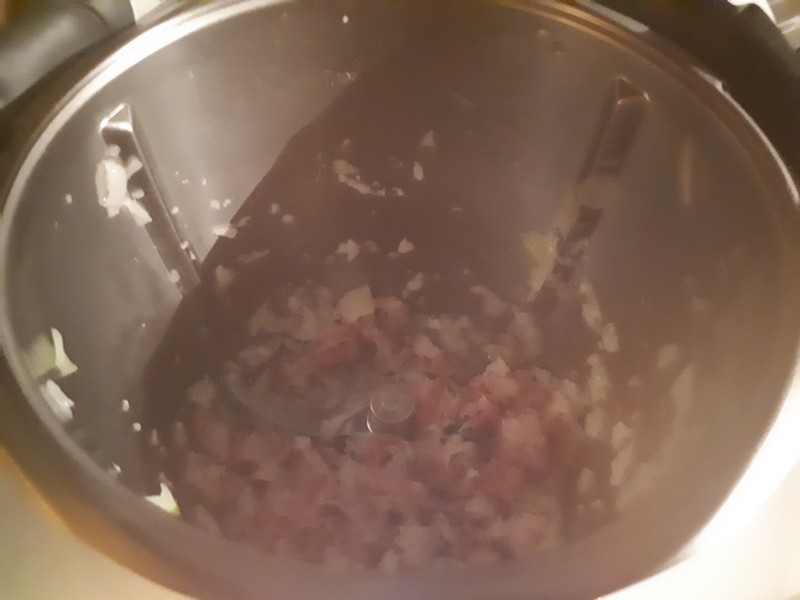 1. Éplucher l’oignon, le couper en deux le mettre dans le bol et mixer 5sec/vit5, ajouter la pancetta coupée en lanières et l’huile d’olive puis faire chauffer 3min/120°C/couteau inversé/vit1.