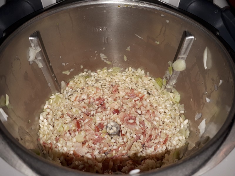 2. Ajouter le riz, mélanger 1min/couteau inversé/vit1,  verser le vin blanc par dessus et mélanger 2 min/couteau inversé/vit1.