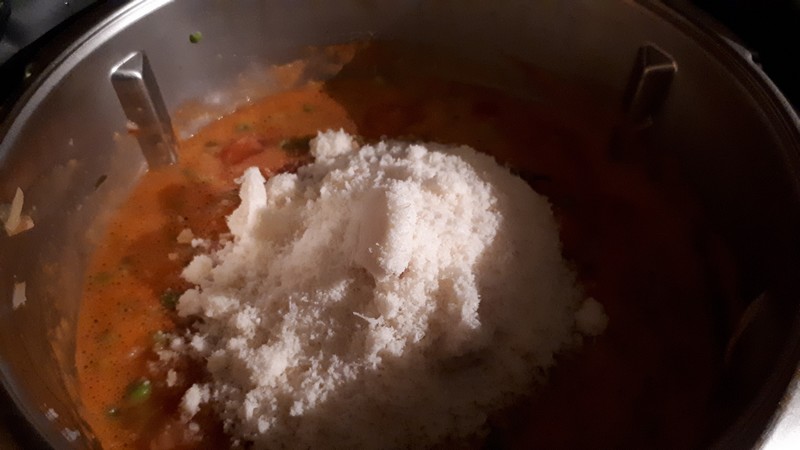 4. Ajouter le parmesan puis faire chauffer 5 min/95°C/couteau inversé/vit1 sans le gobelet mais avec le panier cuisson sur le dessus pour éviter les projections.
