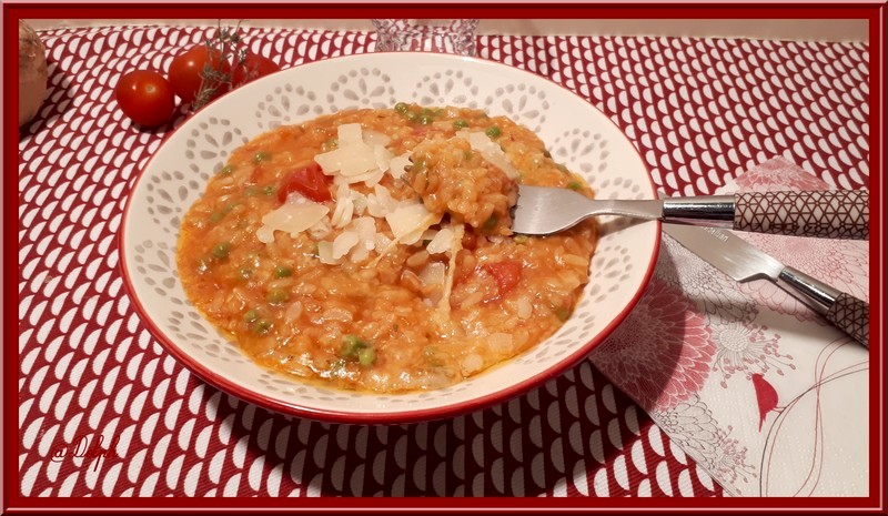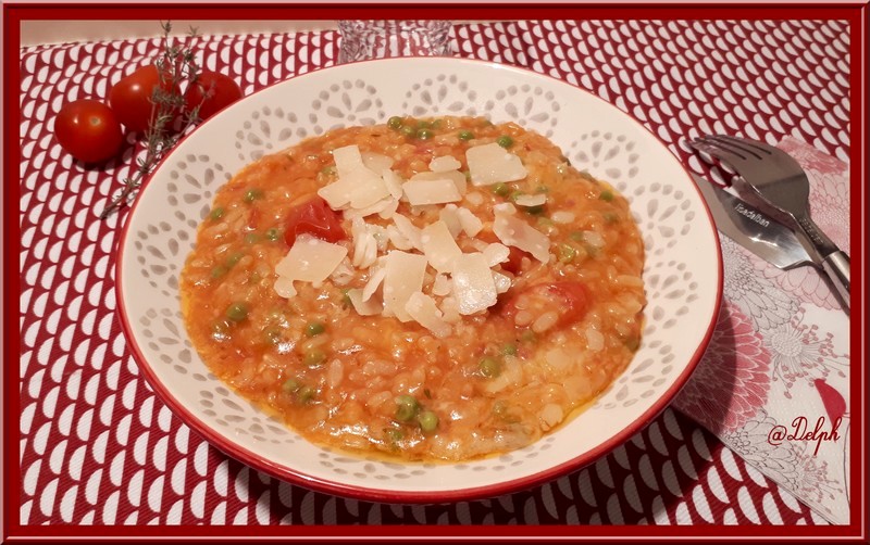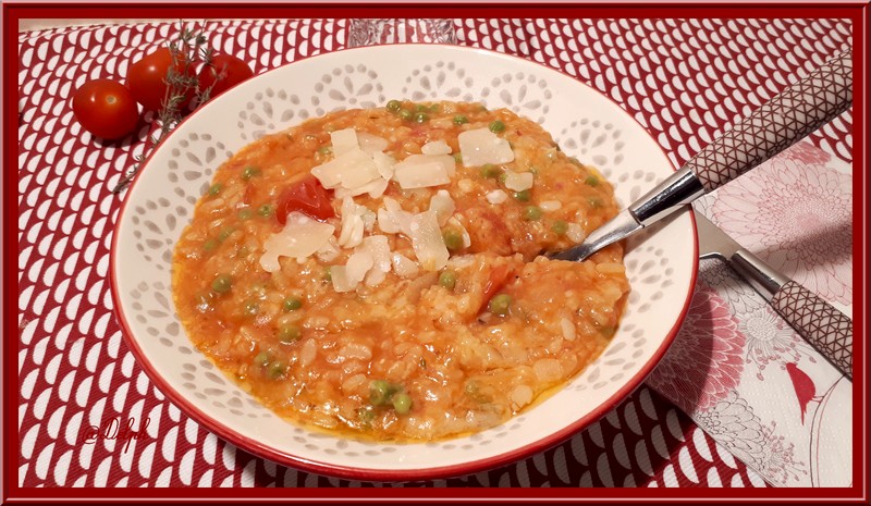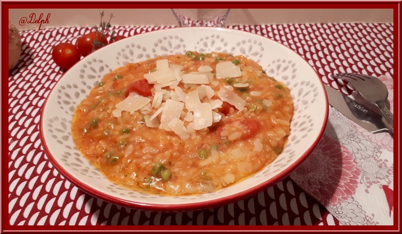 Risotto à la tomate, petits pois et pancetta