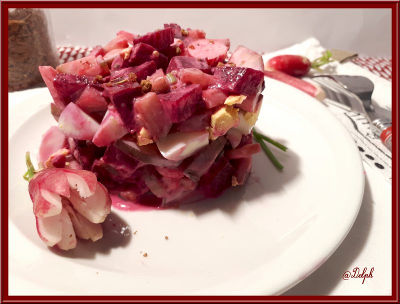 Génial, tu fais coup double aujourd’hui, je n’arrive plus à savoir l’ingrédient du mois. Dommage car j’aime bien ce jeu 🙂 J’en ai fait aussi des salades russes, bielorusses, polonaises ….Une même base ou presque mais la nationalité différente. Super, gros bisous Delphine
