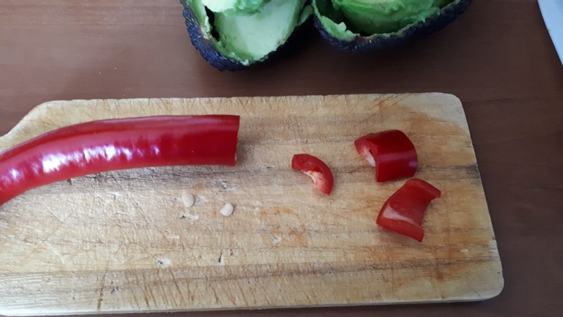 - Laver le piment et prélever un petit bout. Éplucher et émincer l’échalote. Placer la chair d’avocat, les morceaux de piment, les épices et l’échalote émincée dans votre robot.