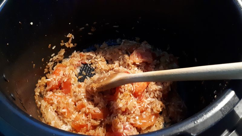 - Remettre un peu d’huile et déposer vos oignons hachés et les faire dorer 2 minutes, ajouter les dés de tomates et passer en mode mijotage pendant 5 minutes en mélangeant, ajouter le riz puis le reste des épices; mélanger , ajouter les pilons de tomates mélanger et laisser mijoter à nouveau 6 minutes.