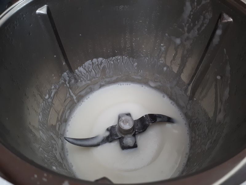 - Mettre dans le bol, le lait de coco, le sucre et la maïzena, puis faire chauffer 10min/100°C/vit2.
