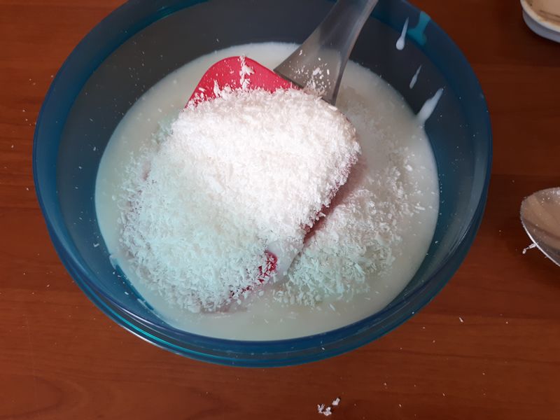 - Ajouter la noix de coco et mélanger avec la spatule.