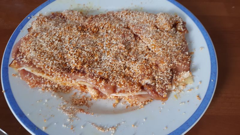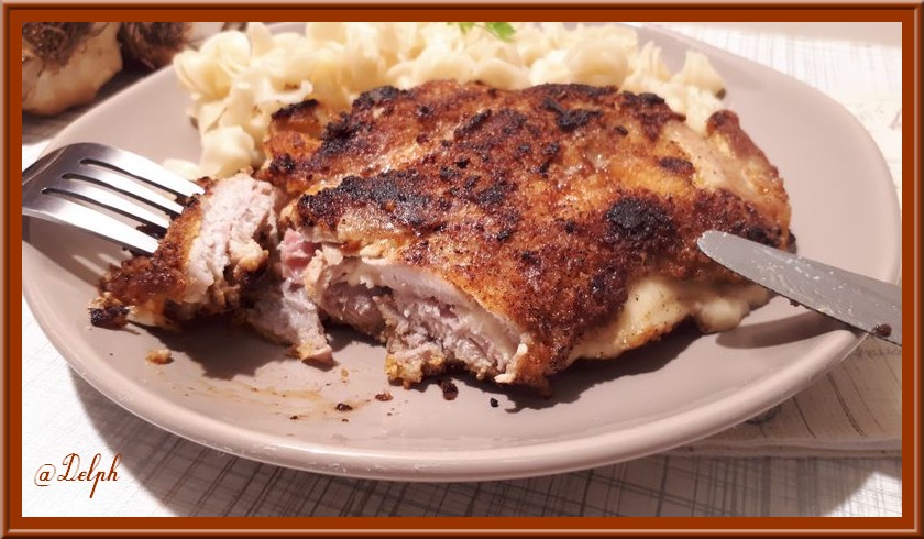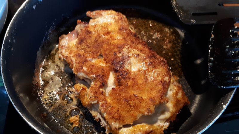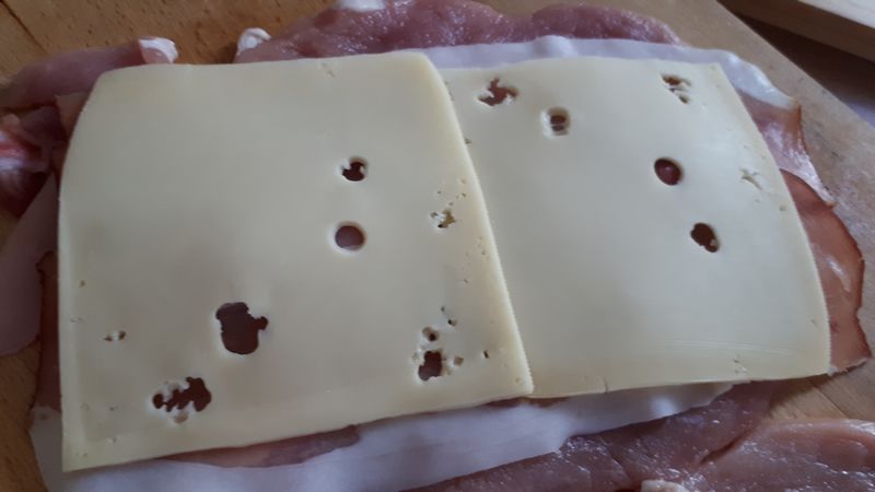 5. Glisser à l’intérieur des escalopes de porc, une tranche de fromage, et de jambon fumé. Les passer ensuite dans le mélange à base d’oeufs, puis, dans la chapelure.