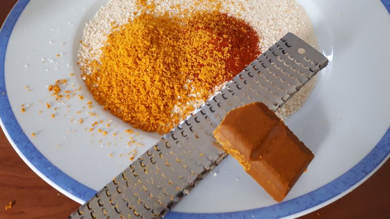 3. Dans un saladier, mélanger la chapelure et le piment. Incorporer le carré futé an le râpant avec une microplane. Saler et poivrer.