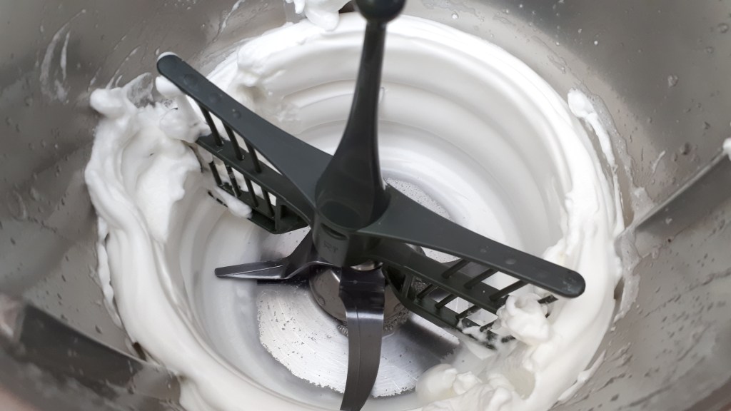 - Mettre les blancs dans le bol, donner deux coups de turbo puis ajouter le fouet et fouetter 2 min/vit3,5 sans le couvercle. Réserver inutile de rincer le bol.