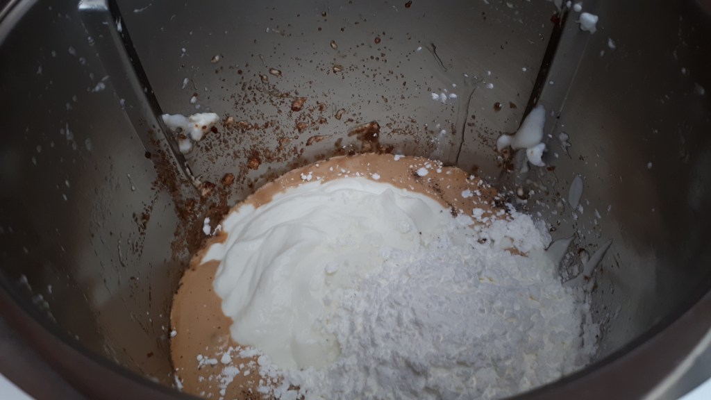- Dans le bol, fouetter les jaunes d’œufs avec le sucre 1 min/vit3, ajouter le fromage blanc, la maïzena, la vanille en poudre et l’extrait de vanille puis mélanger 30sec/vit4.