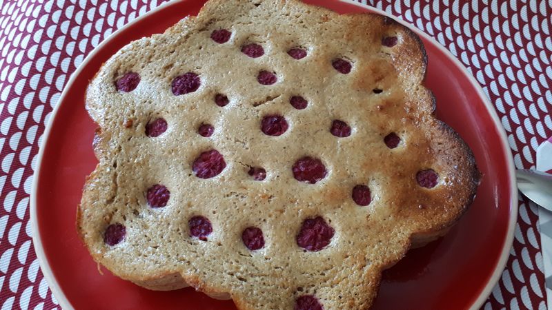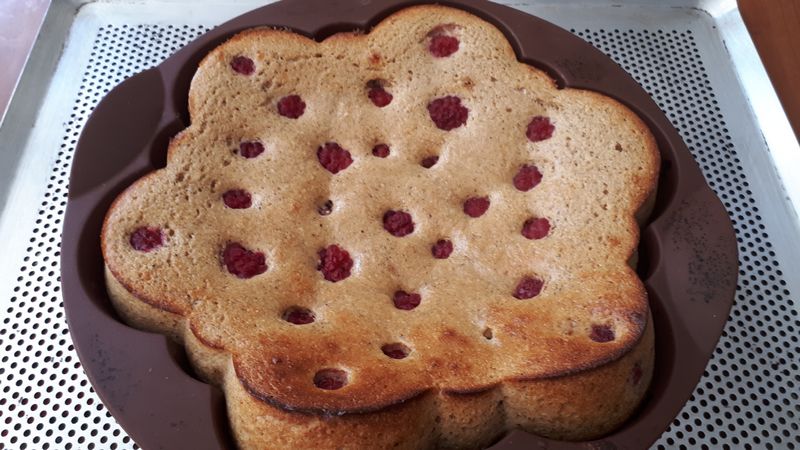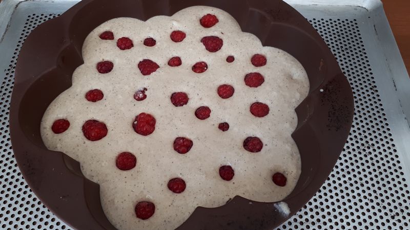 - Verser le tout dans un moule à manqué, beurré si il n’est pas en silicone, enfoncer délicatement les framboises dans la pâte.